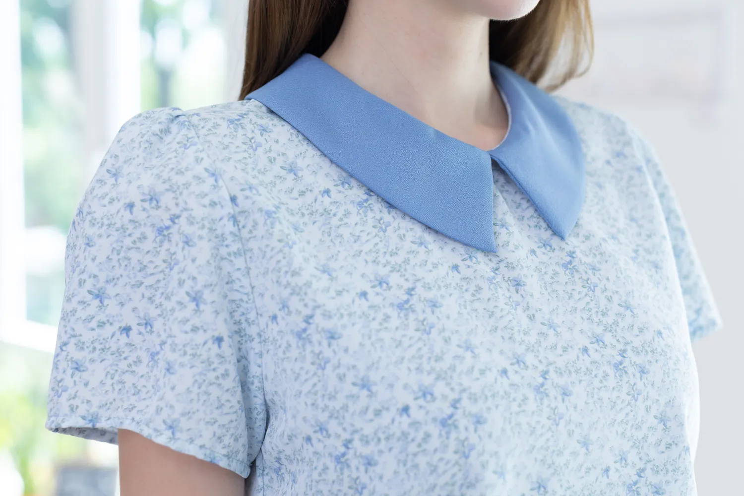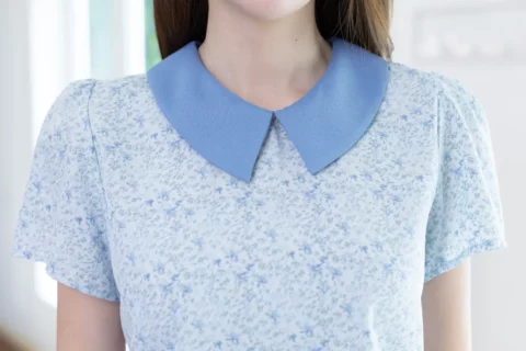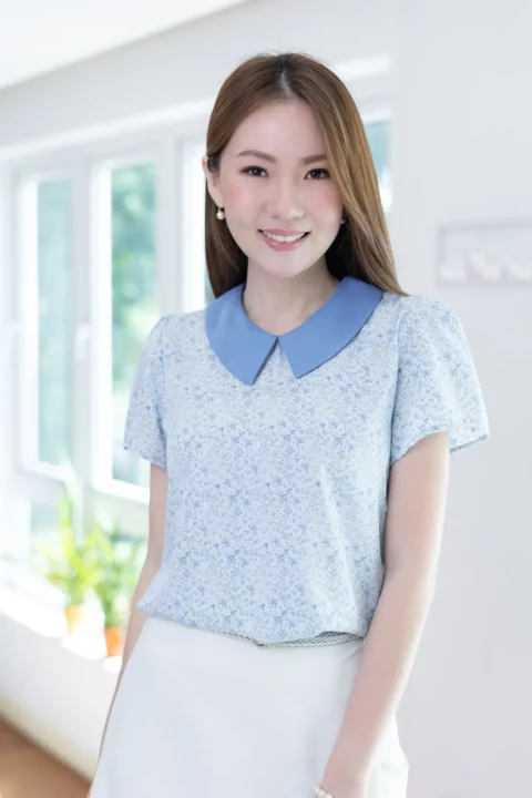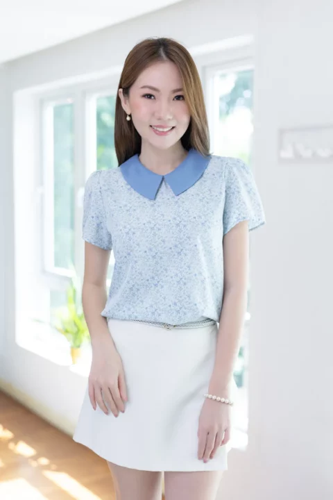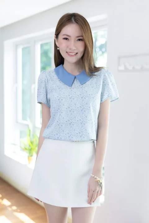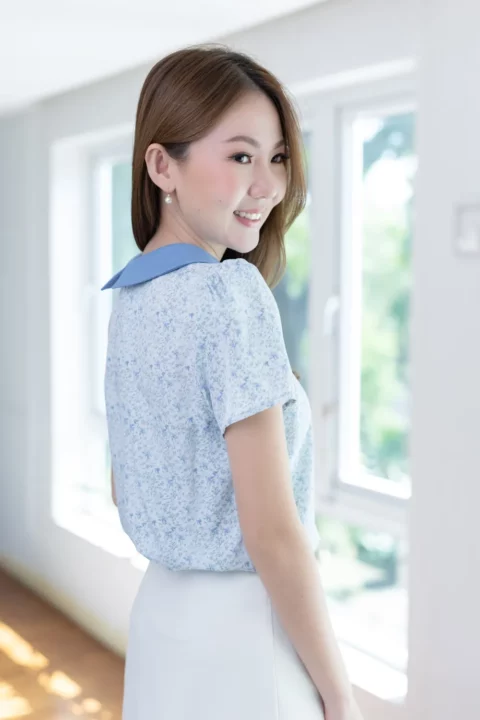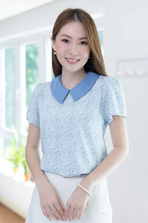 เสื้อทำงานเนื้อผ้านิ่มๆลื่นๆ รีดง่าย ตัวเสื้อใช้ผ้าพิมพ์ลายดอกไม้ ต่อปกบัวตัดปลายแหลมสีพื้น แขนสั้นแบบใส่ง่าย ทรงมีปกสวยสุภาพ ใส่ได้เรื่อยๆเลยค่ะ