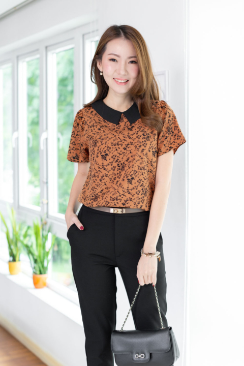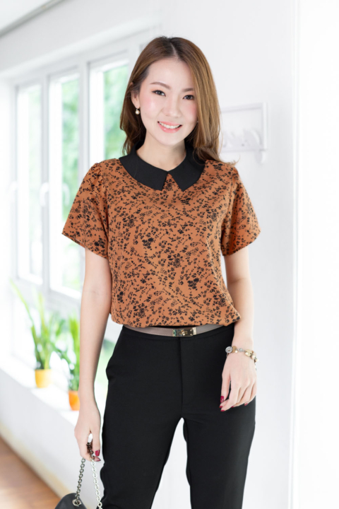 เสื้อทำงานเนื้อผ้านิ่มๆลื่นๆ รีดง่าย ตัวเสื้อใช้ผ้าพิมพ์ลายดอกไม้เล็กๆ ต่อปกบัวตัดปลายแหลมสีพื้น แขนสั้นแบบใส่ง่าย ทรงมีปกสวยสุภาพ ใส่ได้เรื่อยๆเลยค่ะ