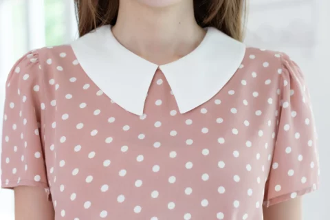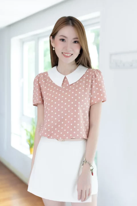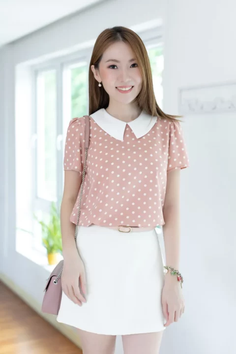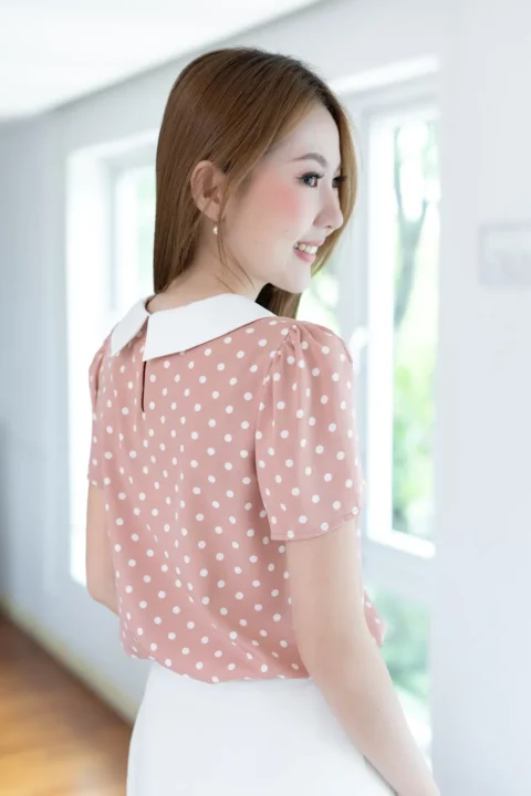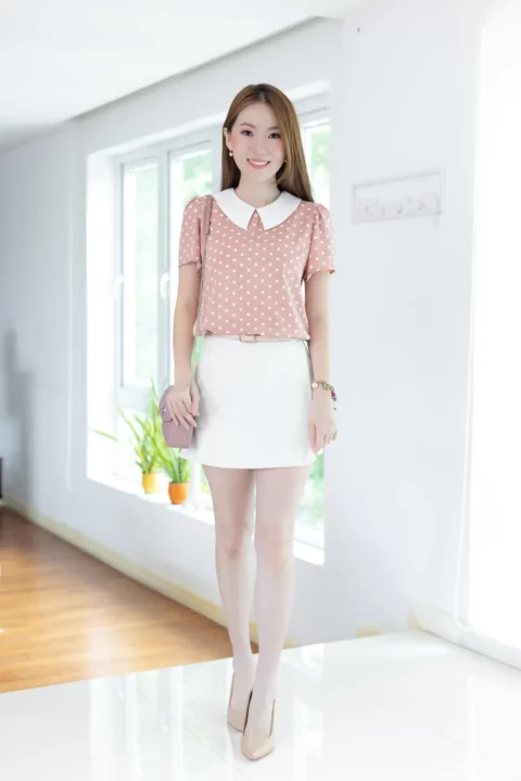 เสื้อทำงานเนื้อผ้านิ่มๆลื่นๆ รีดง่าย ตัวเสื้อใช้ผ้าพิมพ์ลายจุด ต่อปกบัวตัดปลายแหลมสีพื้น แขนสั้นแบบใส่ง่าย ทรงมีปกสวยสุภาพ ใส่ได้เรื่อยๆเลยค่ะ