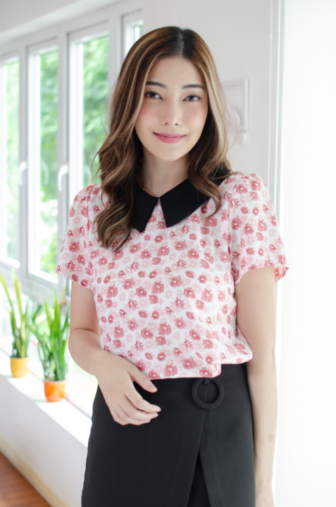 เสื้อทำงานเนื้อผ้านิ่มๆ รีดง่าย พิมพ์ลายดอกไม้ ต่อปกบัวตัดปลายแหลม แขนสั้นแบบใส่ง่าย ทรงมีปกสวยสุภาพ ใส่ได้เรื่อยๆเลยค่ะ