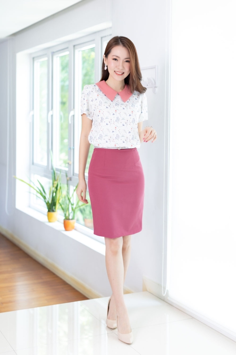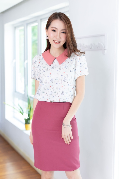 เสื้อทำงานเนื้อผ้านิ่มๆลื่นๆ รีดง่าย ตัวเสื้อใช้ผ้าพิมพ์ลายดิจิตอล เป็นลายดอกไม้ตะร้ากก ต่อปกบัวตัดปลายแหลมสีพื้น แขนสั้นแบบใส่ง่าย ทรงมีปกสวยสุภาพ ใส่ได้เรื่อยๆเลยค่ะ