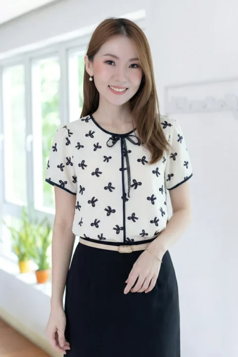 เสื้อทรงสบายๆ กุ๊นสีตัดรอบคอ ปลายแขน และตะเข็บกลางด้านหน้า พร้อมแต่งลูกไม้ฟูๆยาวด้านหน้าไว้ผูกโบว์ แขนเสื้อสั้นมีจีบปลายแขนให้ดูเข้าทรงนิดๆ คัดผ้าลายน่ารักๆ ที่ดูแลง่ายเหมือนเดิมมาให้แล้วค่ะ