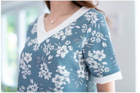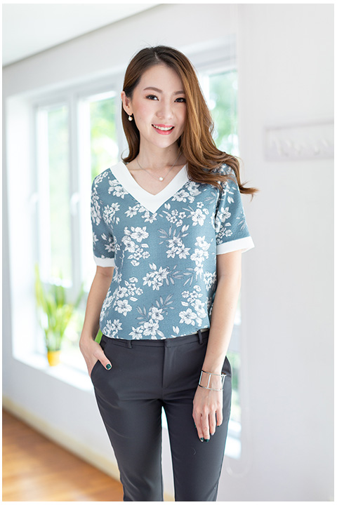 เสื้อคอวี ทรงคอเก๋แต่งแถบสีพื้นตัดบนผ้าลายดอกไม้ คอวีทั้งหน้าและหลัง ตัวเสื้อตัดเย็บด้วยผ้าโพลีเอสเตอร์ผสม อัดลายซ้อนบนลายพิมพ์ ผ้าดูมี Texture ในตัว รุ่นนี้เป็นแบบสวมนะคะ สีสวยน้ำเงินหม่นๆอมเทา งามมากค่า