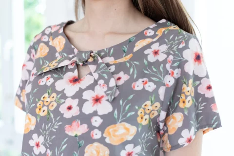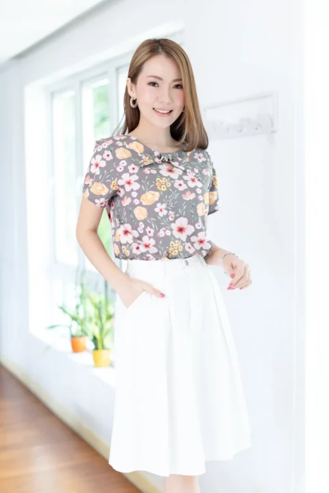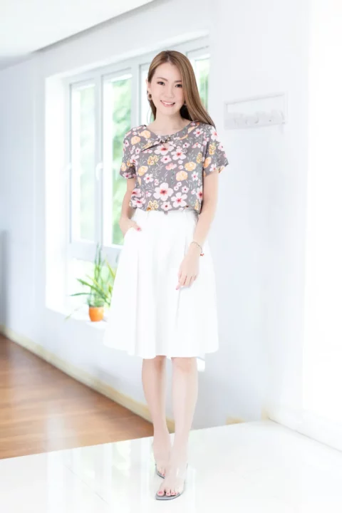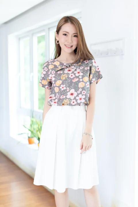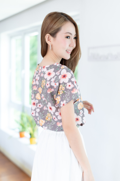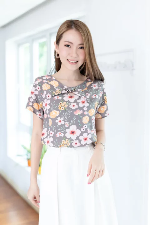 เสื้อทรงปล่อยๆสบาย กับงานโบว์สุดจะน่ารัก พิมพ์ลายดอกไม้ คอกลมปาดแต่งขอบหนา เจาะสามเหลี่ยมด้านหน้า มาพร้อมสายสั้นแบบแยกชิ้นไว้ผูกโบว์ เวรี่กุ๊กกิ๊ก ชายเสื้อโค้งๆ ลินินผสม ทรงดูสบายๆ ลายพิมพ์ดอกไม้ สีสวยเก๋ไก๋
