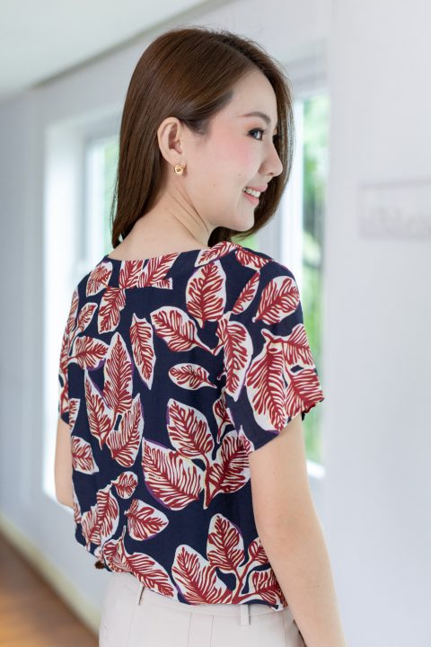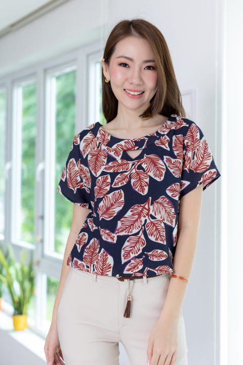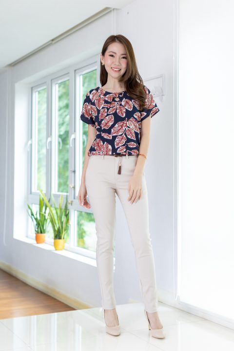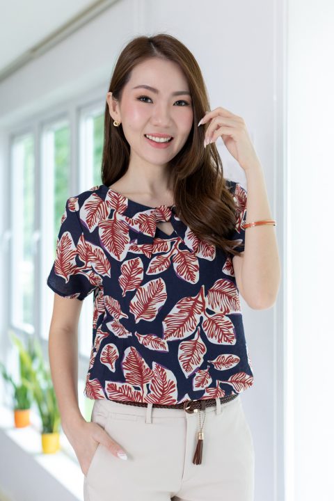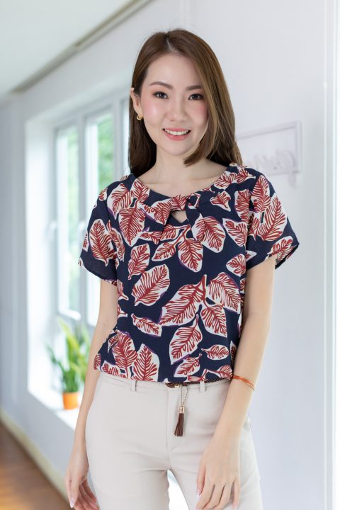 เสื้อทรงปล่อย กับงานโบว์สุดจะน่ารัก พิมพ์ลายใบไม้ คอกลมปาดแต่งขอบหนา เจาะสามเหลี่ยมด้านหน้า มาพร้อมสายสั้นแบบแยกชิ้นไว้ผูกโบว์ เวรี่กุ๊กกิ๊ก ชายเสื้อโค้งๆ เนื้อคอตตอนซิลค์รุ่นนี้ยับนิดๆ มี texture ใส่สบาย เหมาะกับโหมด Vacay ค่า