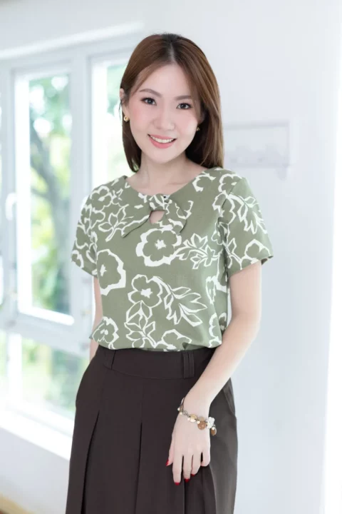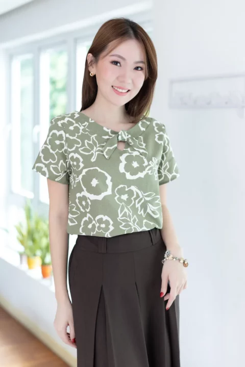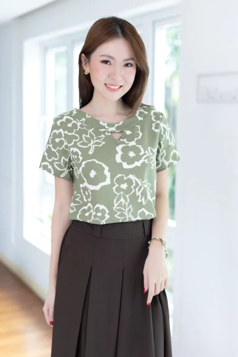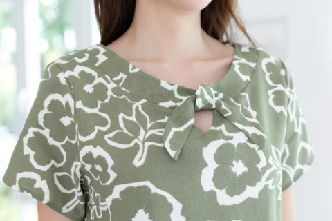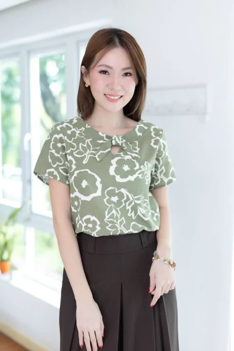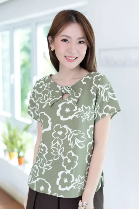 เสื้อทรงปล่อยๆสบาย กับงานโบว์สุดจะน่ารัก พิมพ์ลายดอกไม้ คอกลมปาดแต่งขอบหนา เจาะสามเหลี่ยมด้านหน้า มาพร้อมสายสั้นแบบแยกชิ้นไว้ผูกโบว์ เวรี่กุ๊กกิ๊ก ชายเสื้อโค้งๆ