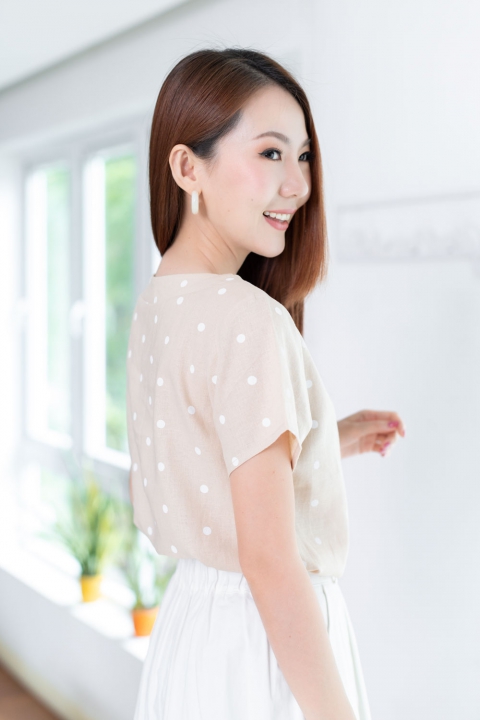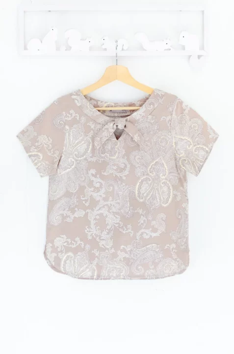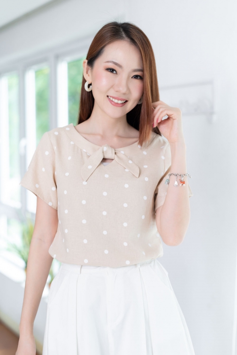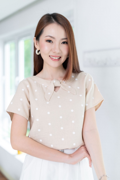 เสื้อทรงปล่อยๆสบาย กับงานโบว์สุดจะน่ารัก คอกลมปาดแต่งขอบหนา เจาะสามเหลี่ยมด้านหน้า มาพร้อมสายสั้นแบบแยกชิ้นไว้ผูกโบว์ เวรี่กุ๊กกิ๊ก ชายเสื้อโค้งๆ ผ้าคอตตอนผสม ลายพิมพ์มู้ดแบบ Oriental สวยงาม