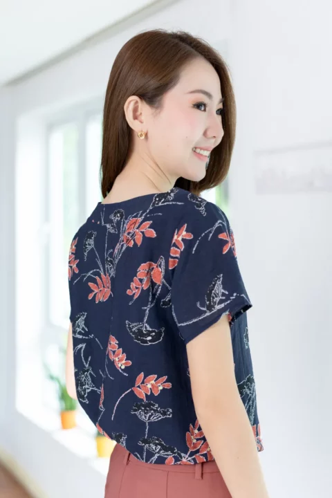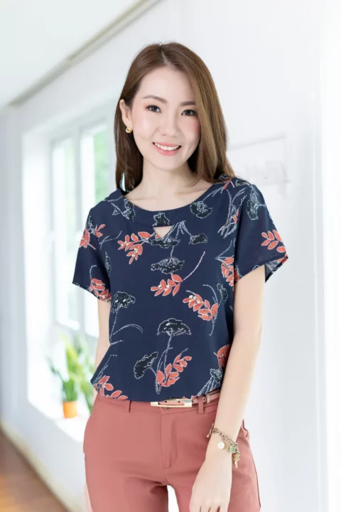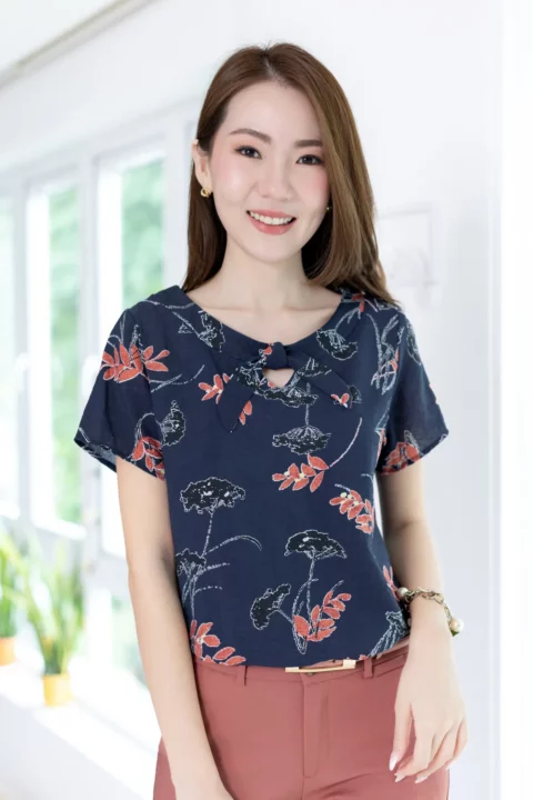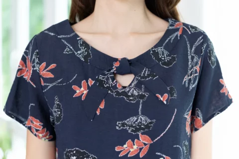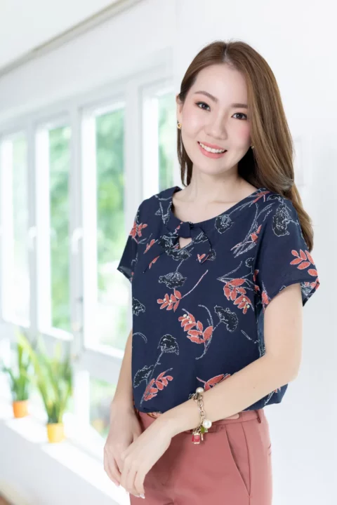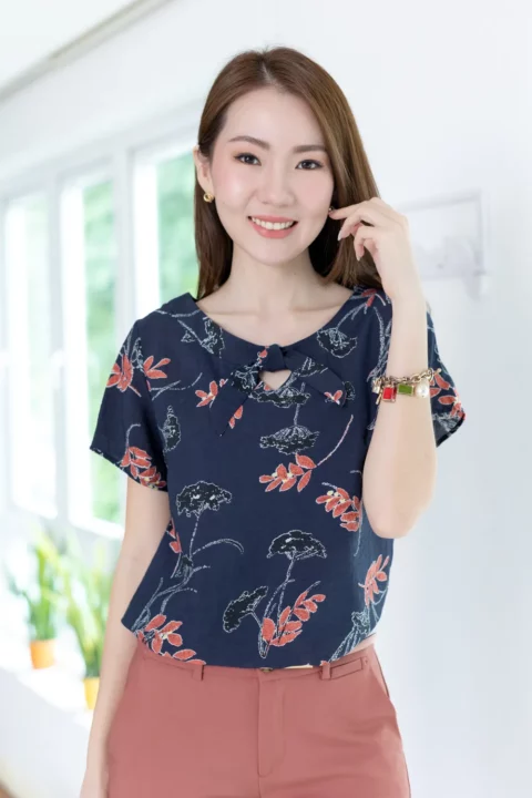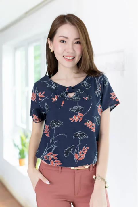 เสื้อทรงปล่อย กับงานโบว์สุดจะน่ารัก พิมพ์ลายกิ่งก้านดอกไม้ คอกลมปาดแต่งขอบหนา เจาะสามเหลี่ยมด้านหน้า มาพร้อมสายสั้นแบบแยกชิ้นไว้ผูกโบว์ เวรี่กุ๊กกิ๊ก ชายเสื้อโค้งๆ เนื้อคอตตอนซิลค์รุ่นนี้ยับนิดๆ ผ้ามี texture ใส่สบายเหมาะกับโหมด Vacay ค่า
