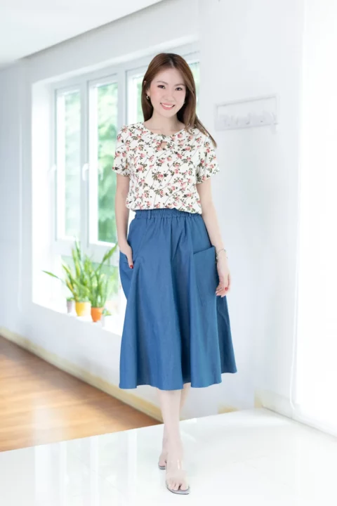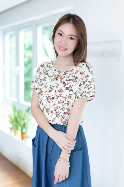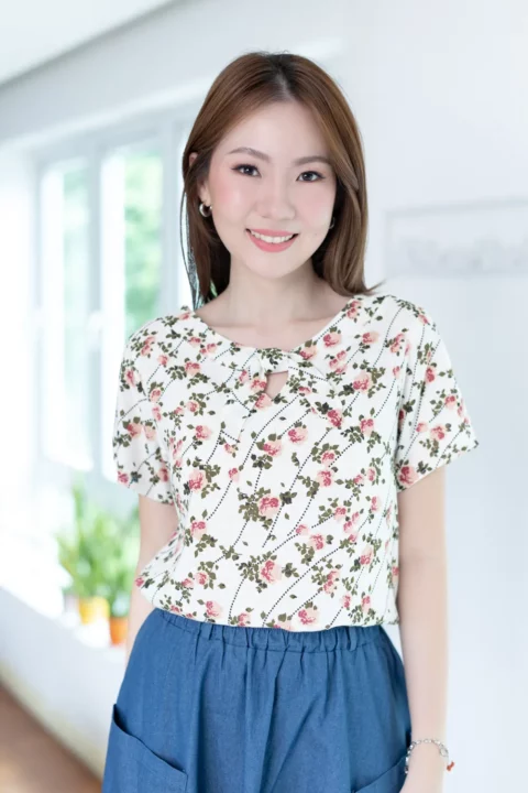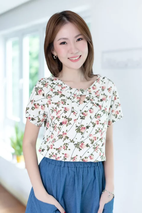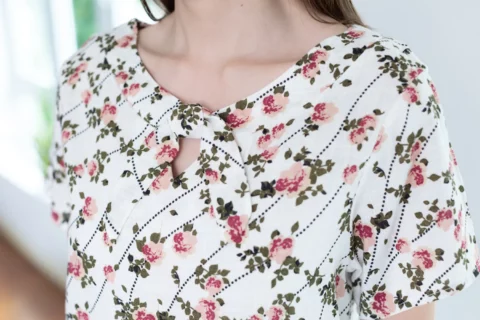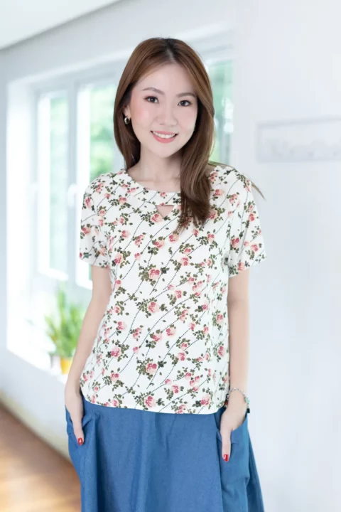 เสื้อทรงปล่อยๆสบาย กับงานโบว์สุดจะน่ารัก พิมพ์ลายดอกไม้ คอกลมปาดแต่งขอบหนา เจาะสามเหลี่ยมด้านหน้า มาพร้อมสายสั้นแบบแยกชิ้นไว้ผูกโบว์ เวรี่กุ๊กกิ๊ก ชายเสื้อโค้งๆ ผ้าคอตตอนผสมลินิน ทอลายสลาฟ ฟีลโปร่งสบาย ผ้ามีน้ำหนักทิ้งตัว