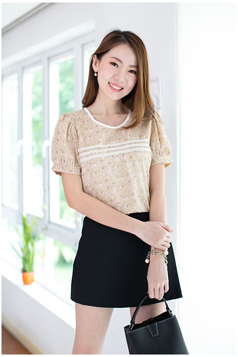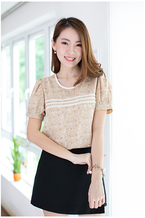 เสื้อน่ารัก! ผ้าพิมพ์ลายดอกไม้เล็กๆ ทรงคอกลมแต่งกุ๊น ต่อแขนบอลลูนพองนิดๆ ด้านหน้าแต่งแถบลูกไม้สีครีม ผ่าหยดน้ำติดกระดุมด้านหลัง แมทช์ง่ายๆกับกระโปรงหรือกางเกงก็เอาอยู่ เป็นชิ้นเบสิค(และน่ารัก!) มีติดตู้ไว้ ใส่ได้บ่อยๆ