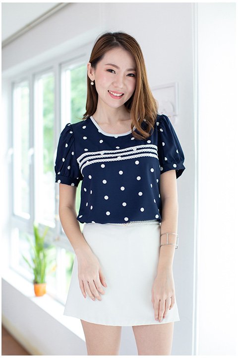 เสื้อน่ารัก! ผ้าพิมพ์ลายจุด ทรงคอกลมแต่งกุ๊น ต่อแขนบอลลูนพองนิดๆ ด้านหน้าแต่งแถบลูกไม้ ผ่าหยดน้ำติดกระดุมด้านหลัง แมทช์ง่ายๆกับกระโปรงหรือกางเกงก็เอาอยู่ เป็นชิ้นเบสิค(และน่ารัก!) มีติดตู้ไว้ ใส่ได้บ่อยๆ