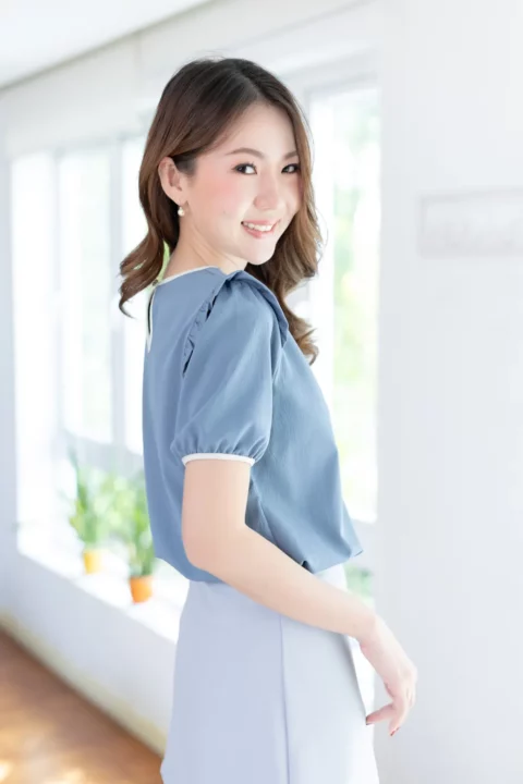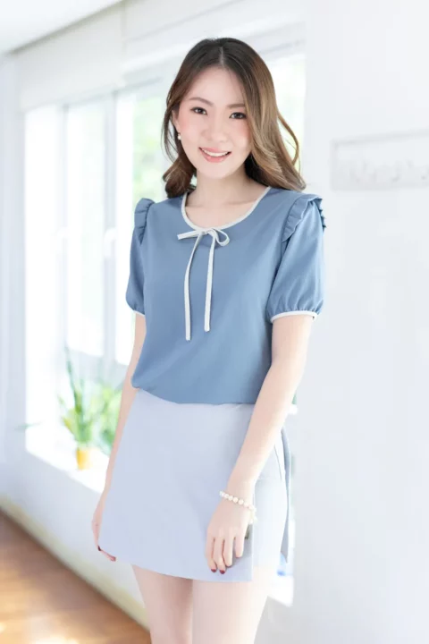 แบบเรียบง่ายพร้อมดีเทลน่ารักๆมาแล้ววว เสื้อคอกลมแต่งกุ๊นและสายโบว์ แขนตุ๊กตาแต่งจีบสั้นๆตรงหัวไหล่ ด้านหลังผ่าหยดน้ำติดกระดุมคอ ใช้เนื้อผ้าย่นมีลายในตัว กุ๊นสีตัดกัน เรียบร้อยแต่ดูน่าสนใจ