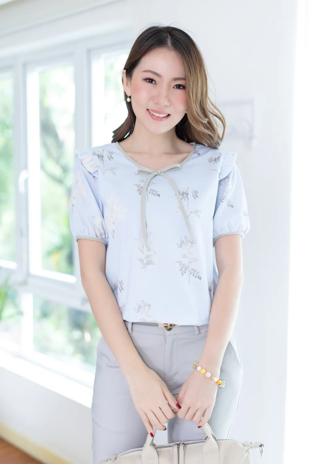 MT2238 Floral Ruff Shoulder Crinkled Blouse – Light Blue