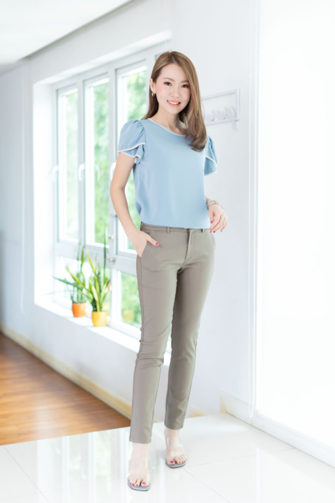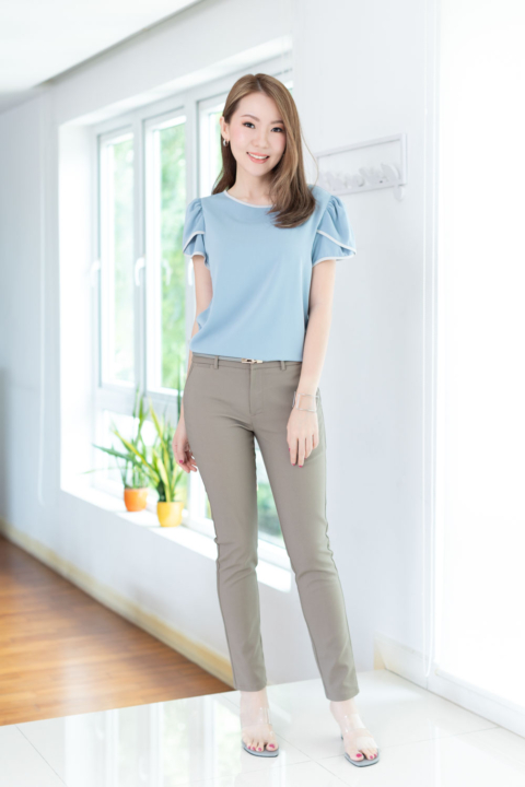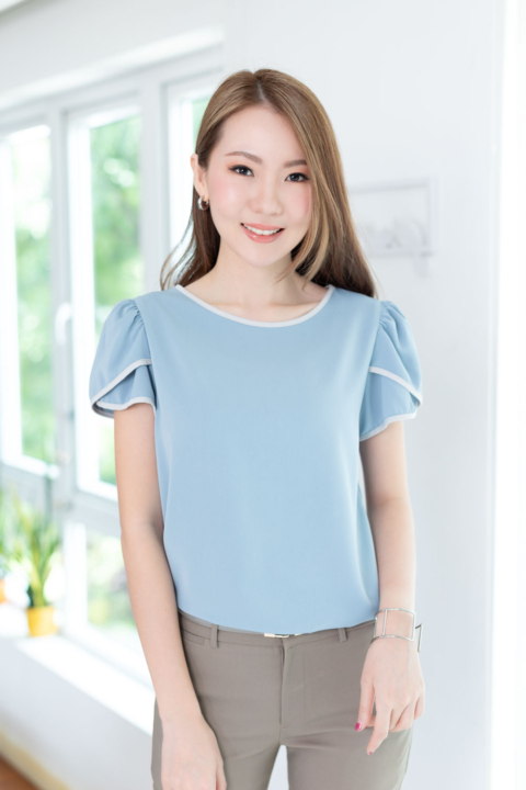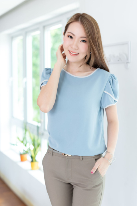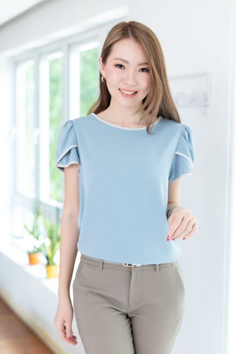 เสื้อทำงานสวยแบบเรียบร้อย กับผ้าดีดี ใส่กันได้ยาวๆ คอกลม แขนทรงกลีบดอกไม้ซ้อน กุ๊นขอบสีตัดกัน เนื้อผ้าลื่นนวลเนียนมากก ผิวเรียบ ไม่บางโป๊ สุด Classy แมทช์ยังไงก็ดูดี