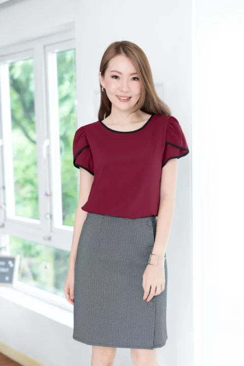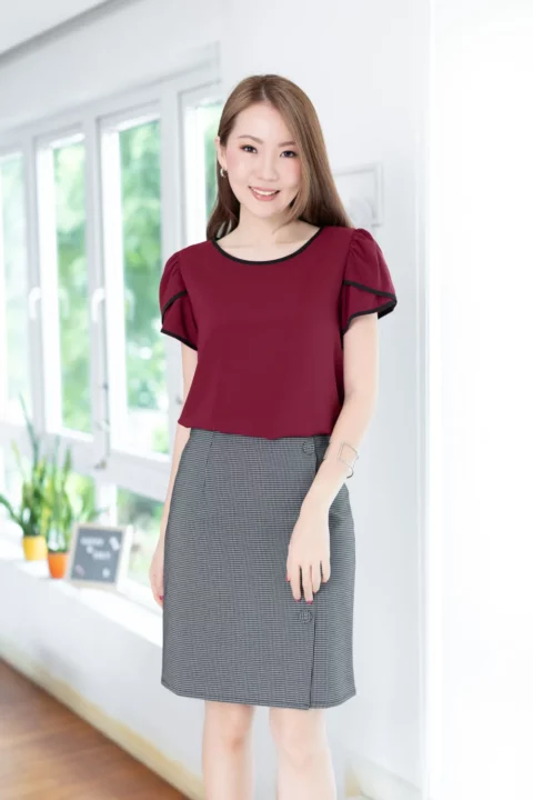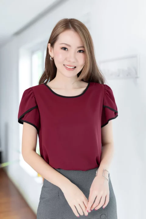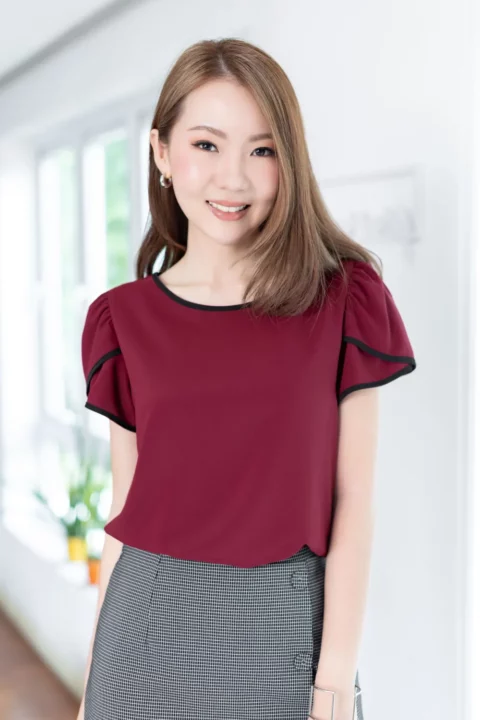 เสื้อทำงานสวยแบบเรียบร้อย กับผ้าดีดี ใส่กันได้ยาวๆ คอกลม แขนทรงกลีบดอกไม้ซ้อน กุ๊นขอบสีตัดกัน เนื้อผ้าลื่นนวลเนียนมากก ผิวเรียบ ไม่บางโป๊ สุด Classy แมทช์ยังไงก็ดูดี
