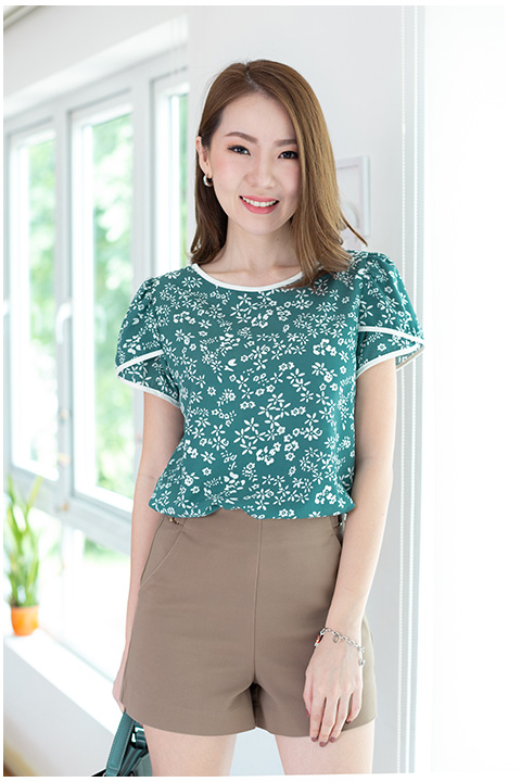 เสื้อทำงานสวยแบบเรียบร้อย กับผ้าดีดี ใส่กันได้ยาวๆ คอกลม แขนทรงกลีบดอกไม้ซ้อนกัน กุ๊นขอบสีตัดกัน เนื้อผ้านิ่มลื่น พิมพ์ลายดอกไม้เล็กๆ สวย Classy แมทช์ยังไงก็ดูดี
