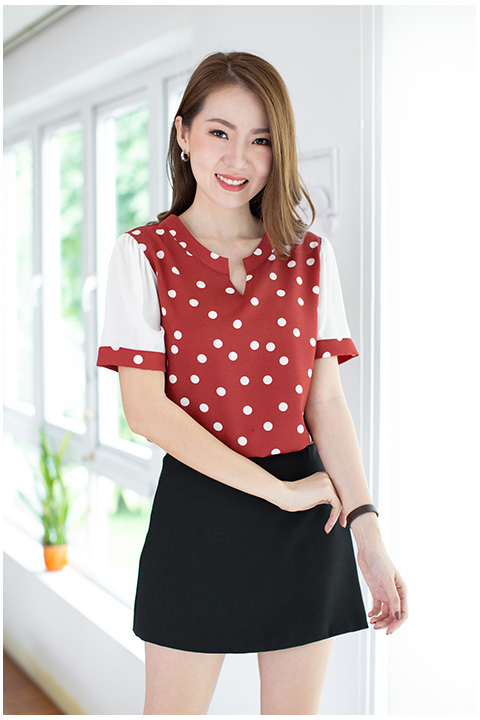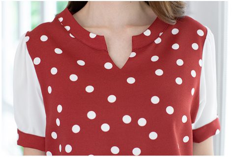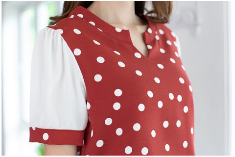 เสื้อทรงเก๋เป็นพิเศษ คอกลม ผ่าวีสั้นๆด้านหน้า ตัวเสื้อเป็นผ้าโอซากาลายจุดเนื้อนิ่มผ้าไม่บางมาก ยับยากด้วยค่ะ พอแต่งแขนสั้นด้วยผ้าชีฟองโปร่งก็จะเก๋ไม่ไหววว ใส่ยังไงก็สวยโดดเด่น