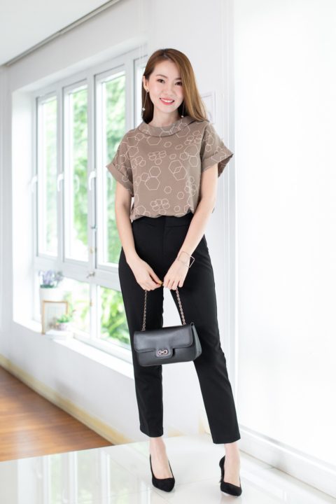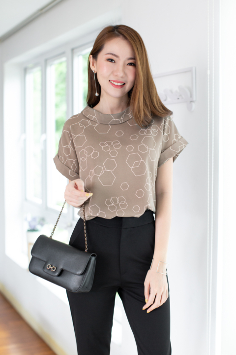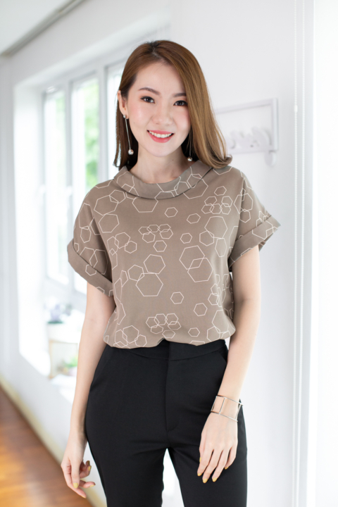 เสื้อดีไซน์ทรงคอม้วน ทรงแขนล้ำพับปลายแขนและเย็บฟิกซ์ ด้านหลังปกแหลม ผ่าหยดน้ำ ติดกระดุม รอบนี้เป็นผ้าอิตาลีลายกราฟิกเท่ห์ๆ ผ้านิ่มเนียน ทรงคลาสสิกใส่ได้ตลอดกาลเลย