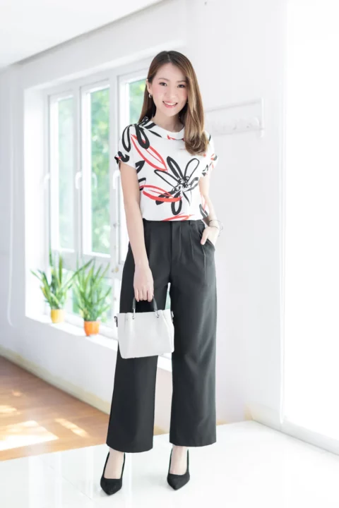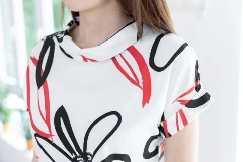 เสื้อดีไซน์ทรงคอม้วน ทรงแขนล้ำพับปลายแขนและเย็บฟิกซ์ ด้านหลังปกแหลม ผ่าหยดน้ำ ติดกระดุม ทรงสบายๆ ลายดอกใหญ่ๆดูเก๋
