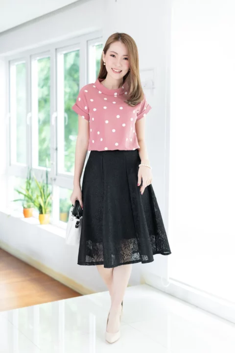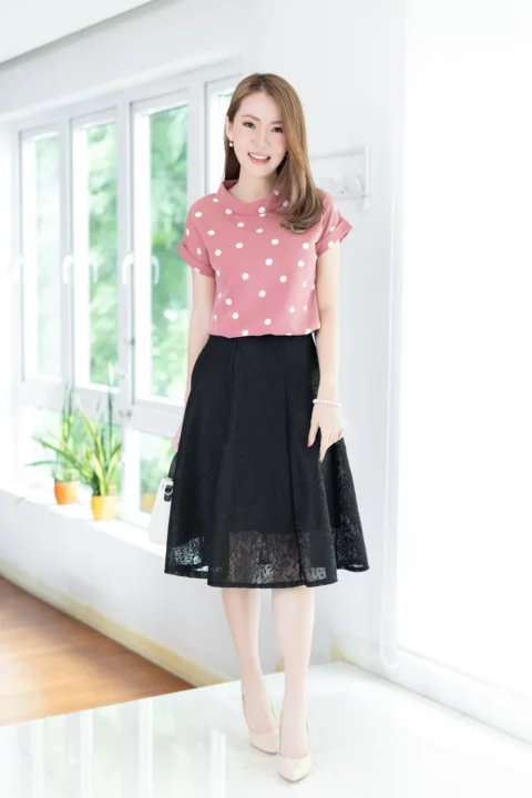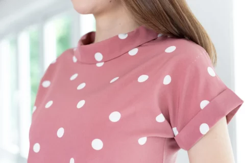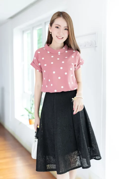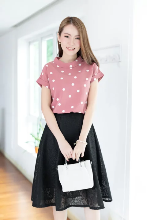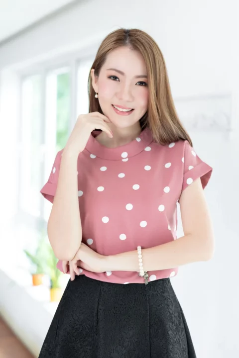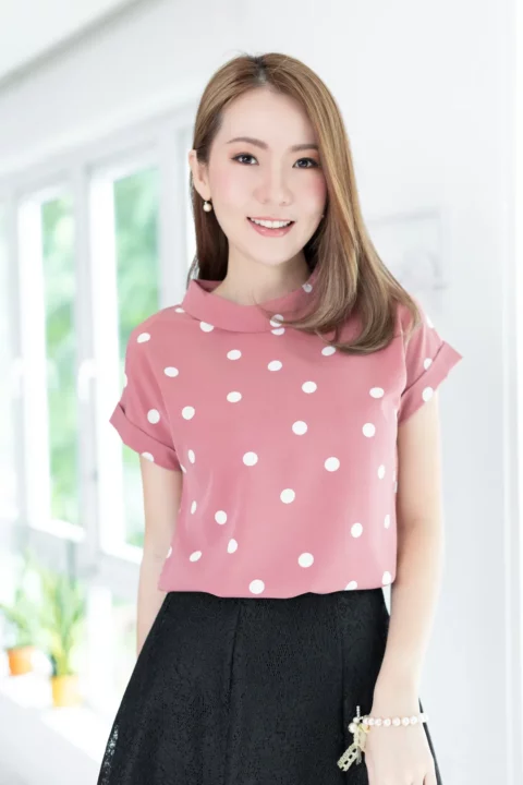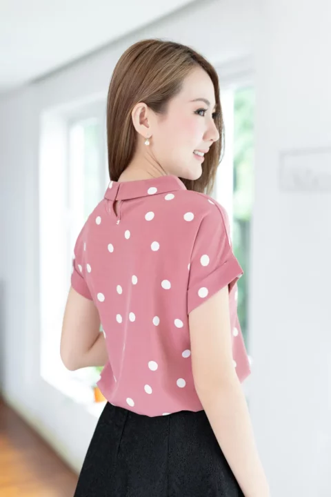 เสื้อดีไซน์ทรงคอม้วน ทรงแขนค้างคาวล้ำๆพับปลายแขนและเย็บฟิกซ์ ด้านหลังปกแหลม ผ่าหยดน้ำ ติดกระดุม รอบนี้เป็นผ้าอิตาลี ผ้าจะนิ่มเนียน พิมพ์ลายจุด ทรงคลาสสิกใส่ได้ตลอดกาลเลย