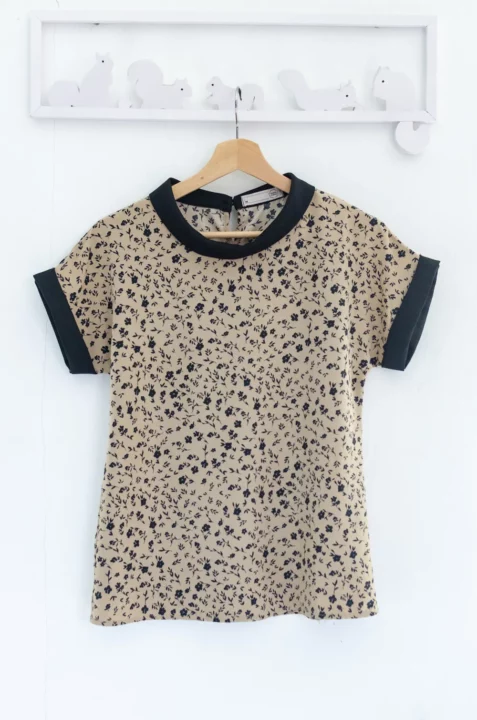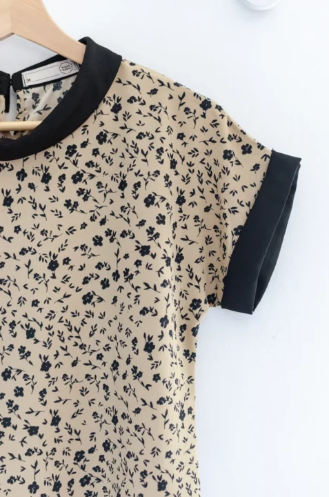 เสื้อดีไซน์ทรงคอม้วน ทรงแขนค้างคาวล้ำๆพับปลายแขนและเย็บฟิกซ์ เพิ่มความเก๋และโดดเด่นด้วยขอบคอและแขนสีตัดกับตัวเสื้อ ด้านหลังผ่าหยดน้ำติดกระดุม