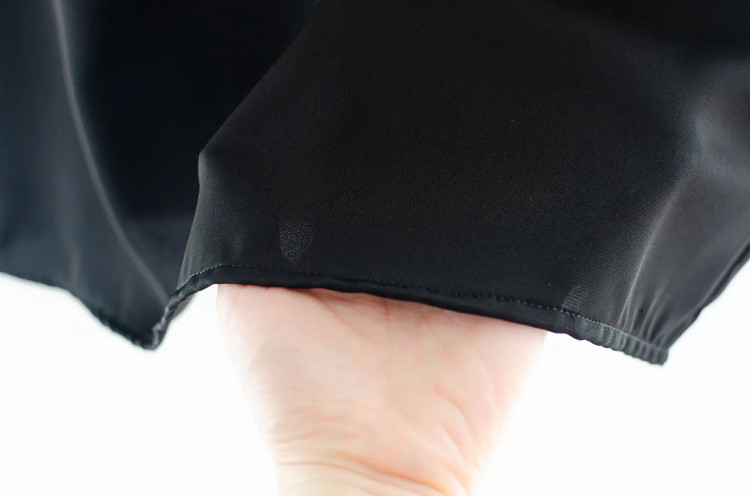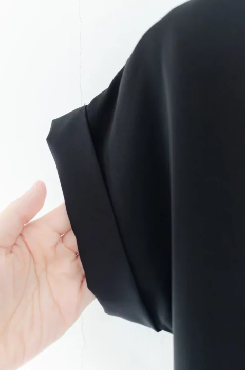 เสื้อดีไซน์ทรงคอม้วน ทรงแขนค้างคาวล้ำๆพับปลายแขนและเย็บฟิกซ์ ด้านหลังปกแหลม ผ่าหยดน้ำ ติดกระดุม ผ้ายืดได้นิดๆ ทรงคลาสสิกใส่ได้ตลอดกาลเลย