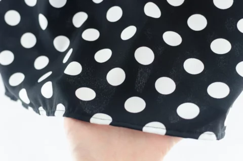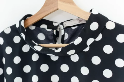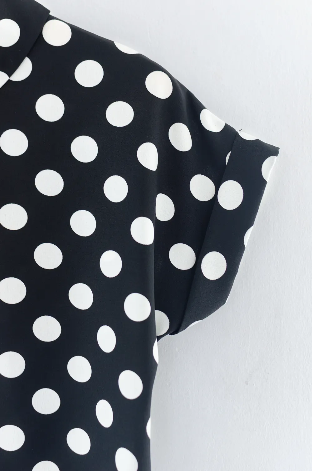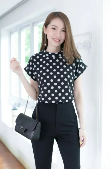 เสื้อดีไซน์ทรงคอม้วน ทรงแขนค้างคาวล้ำๆพับปลายแขนและเย็บฟิกซ์ ด้านหลังปกแหลม ผ่าหยดน้ำ ติดกระดุม รอบนี้เป็นผ้าอิตาลี ผ้าจะนิ่มเนียน พิมพ์ลายจุด ทรงคลาสสิกใส่ได้ตลอดกาลเลย