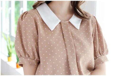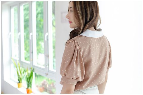 เสื้อทรงสวย แต่งสาบหลอกด้านหน้า ต่อแขนตุ๊กตา Balloon ผ้าลายจุดเนื้อดี ไม่โปร่งแสงมาก แต่งปกสีพื้น แมทช์คู่กระโปรง-กางเกงสีพื้นสวยโดดเด่นเลย