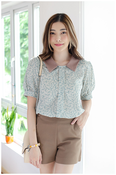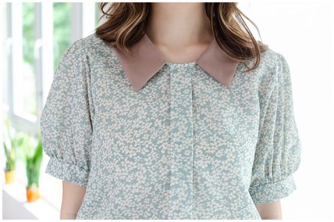เสื้อทรงสวย แต่งสาบหลอกด้านหน้า ต่อแขนตุ๊กตา Balloon ผ้าลายดอกไม้จิ๋วๆ แต่งปกสีพื้น แมทช์คู่กระโปรง-กางเกงสีพื้นสวยโดดเด่นเลย
