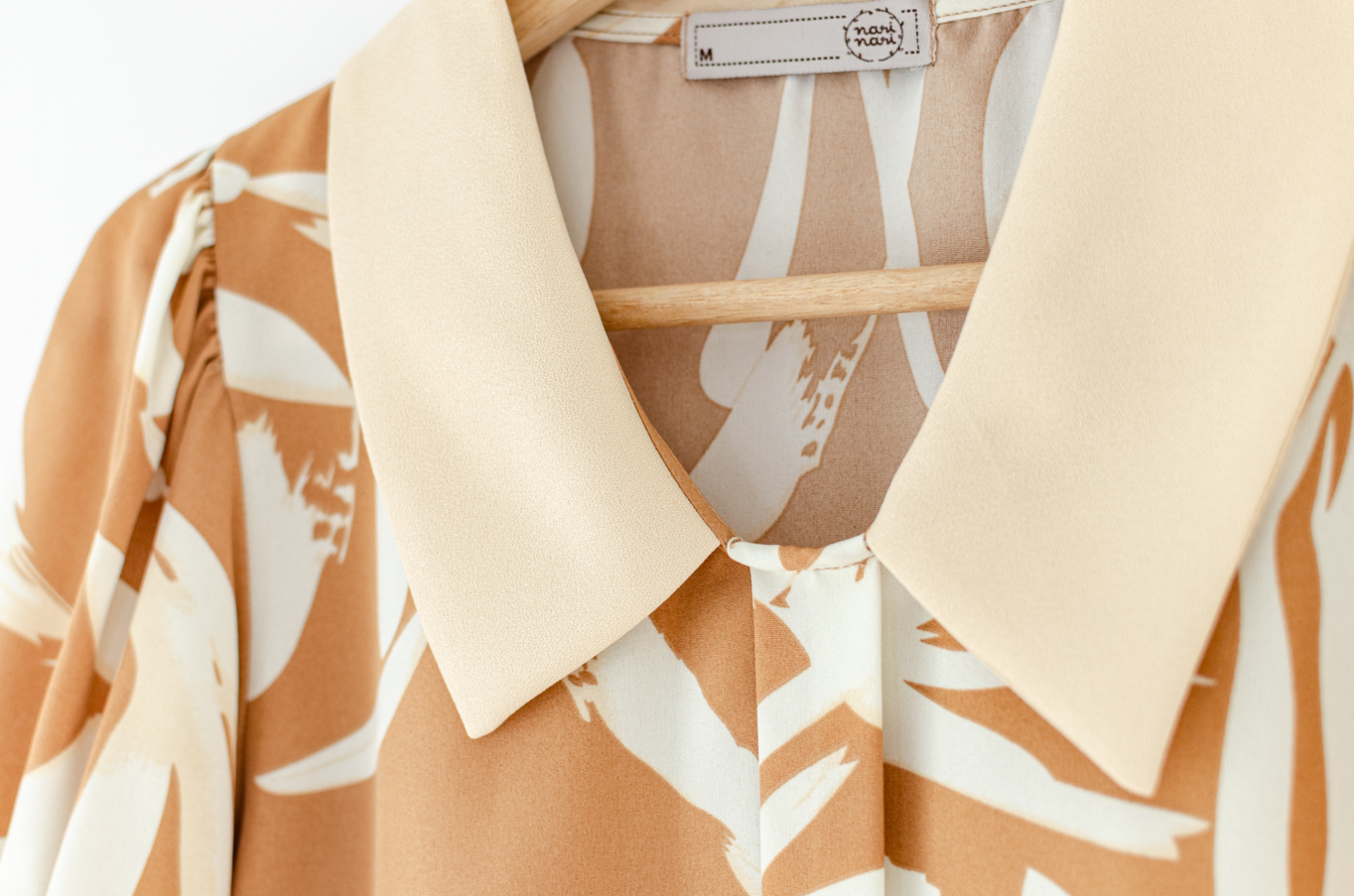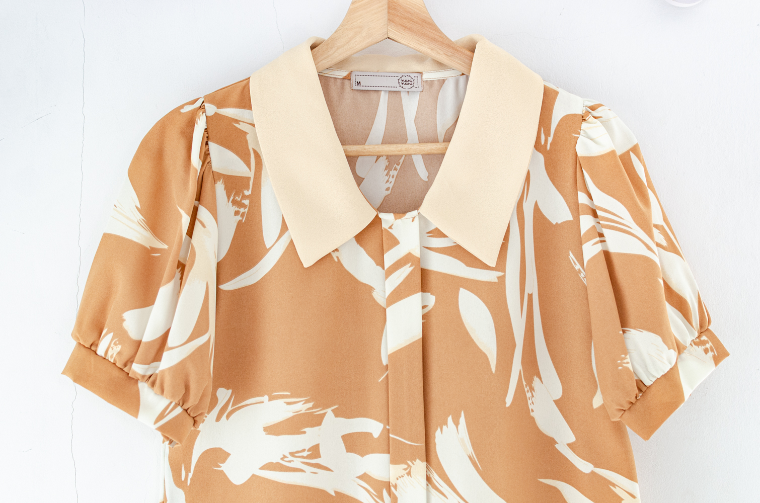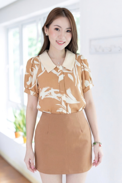 เสื้อทรงสวย แต่งสาบหลอกด้านหน้า ต่อแขนตุ๊กตา Balloon ผ้าพิมพ์ลายเนื้อดี แต่งปกสีพื้น ทรงเสื้อเป็นแบบสวมไม่มีกระดุมหลังคอ แมทช์คู่กระโปรง-กางเกงสีพื้นสวยโดดเด่นเลย
