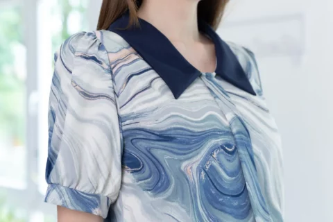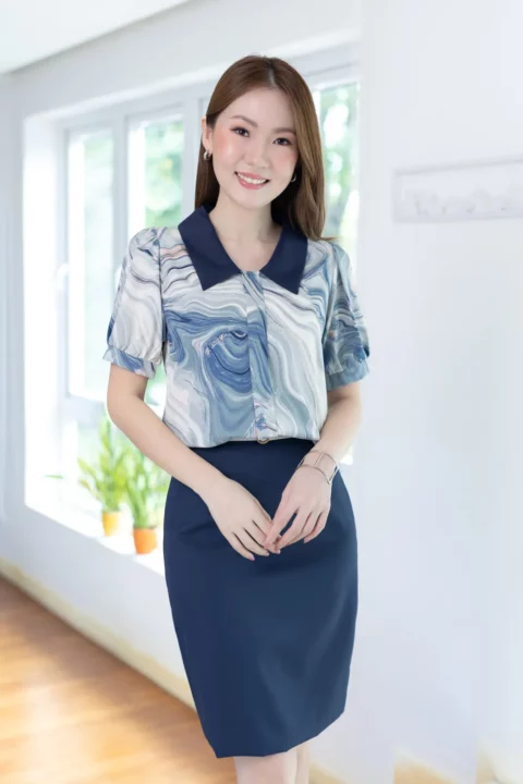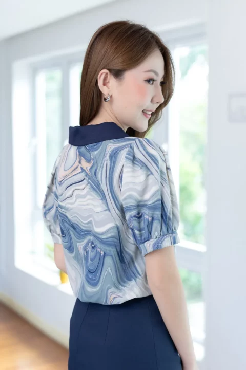 เสื้อทรงสวย แต่งสาบหลอกด้านหน้า ต่อแขนตุ๊กตา Balloon ผ้าพิมพ์ลายเนื้อดี เนียนสบายผิว แต่งปกสีพื้น ทรงเสื้อเป็นแบบสวมไม่มีกระดุมหลังคอ แมทช์คู่กระโปรง-กางเกงสีพื้นสวยโดดเด่นเลย