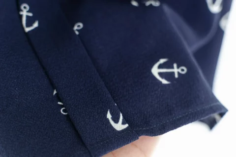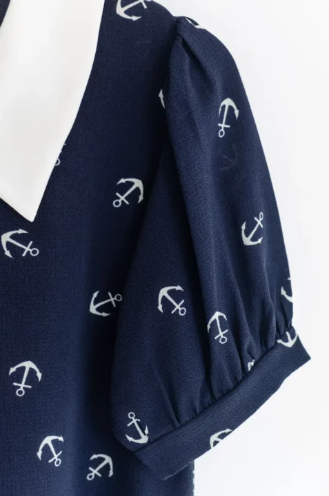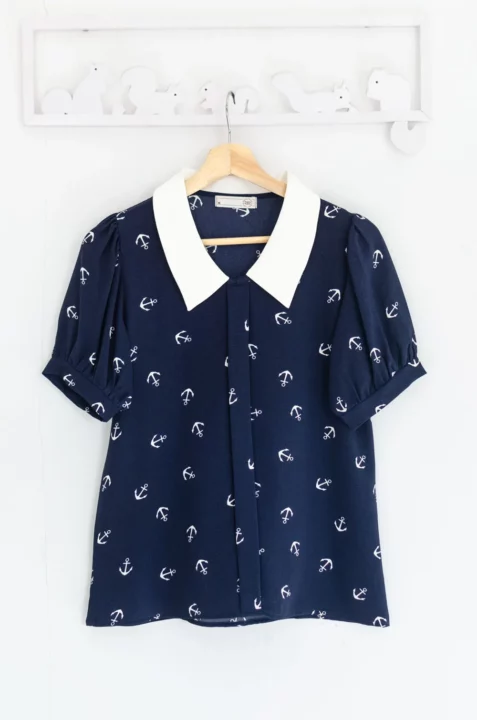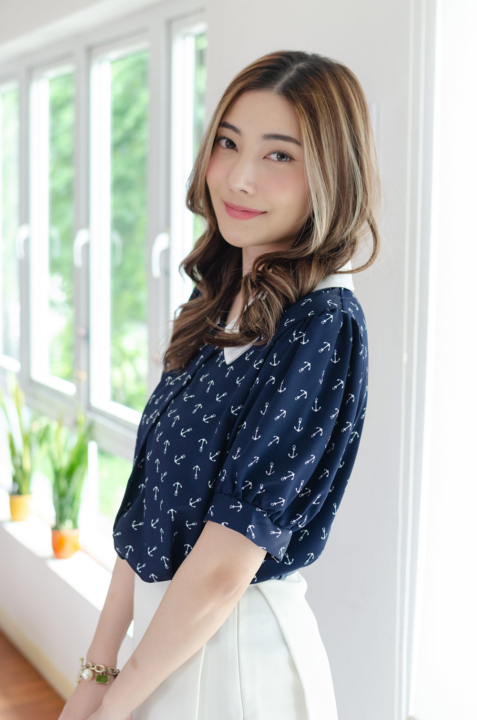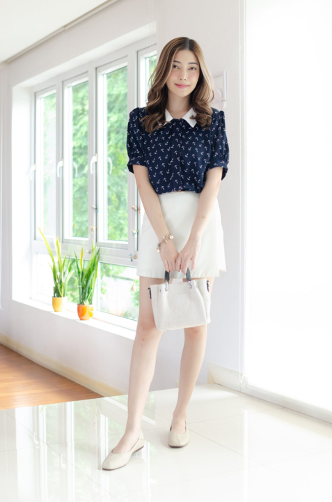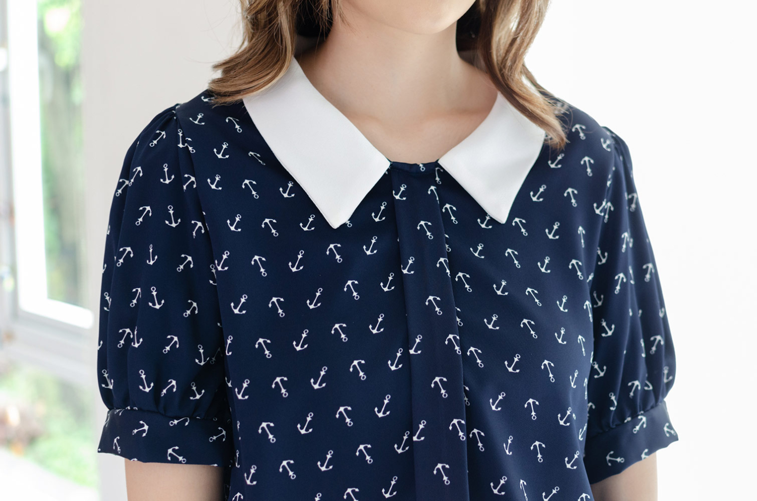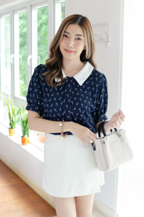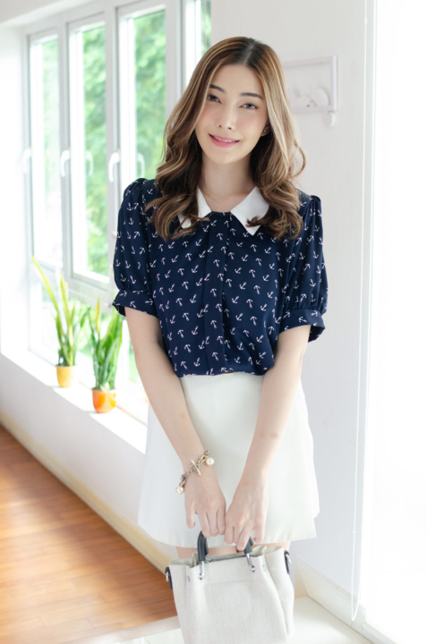 เสื้อทรงสวย แต่งสาบหลอกด้านหน้า ต่อแขนตุ๊กตา Balloon ผ้าลายสวยเนื้อดี ผ้าชีฟองบับเบิ้ลพิมพ์ลายสมอเรือ เนื้อมี texture ในตัว แต่งปกสีพื้น แมทช์คู่กระโปรง-กางเกงสีพื้นสวยโดดเด่นเลย
