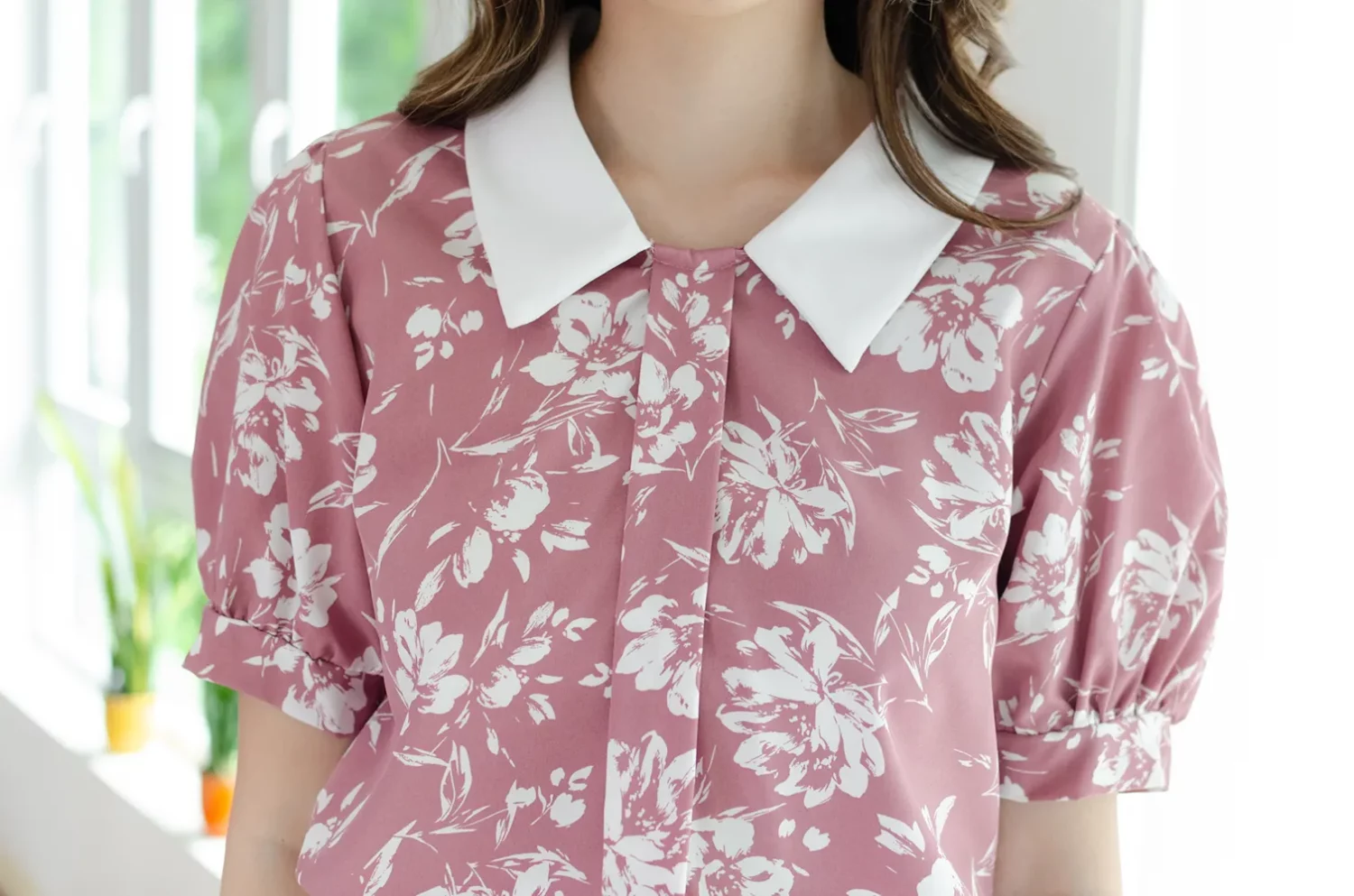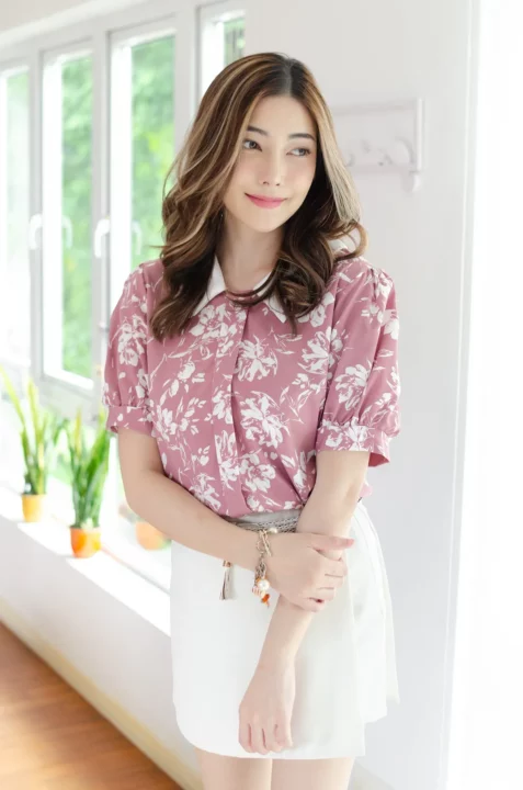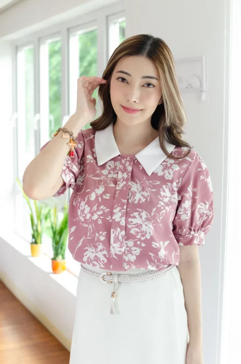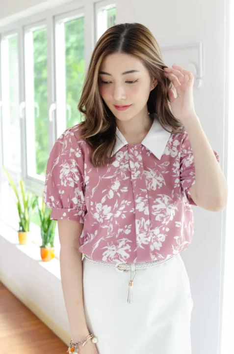 เสื้อทรงสวย แต่งสาบหลอกด้านหน้า ต่อแขนตุ๊กตา Balloon ผ้าลายสวยเนื้อดี ลายพิมพ์ดอกไม้ แต่งปกสีพื้น แมทช์คู่กระโปรง-กางเกงสีพื้นสวยโดดเด่นเลย