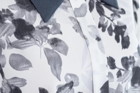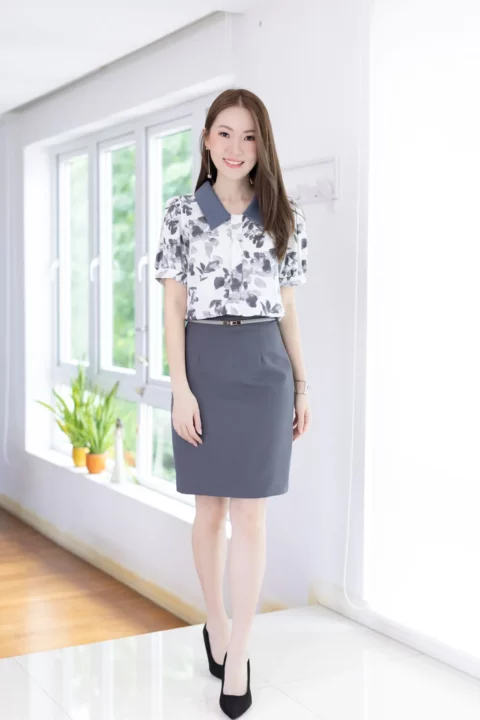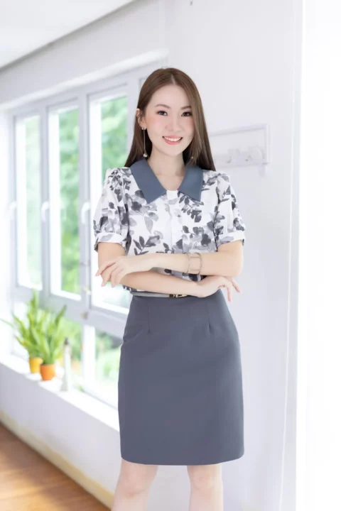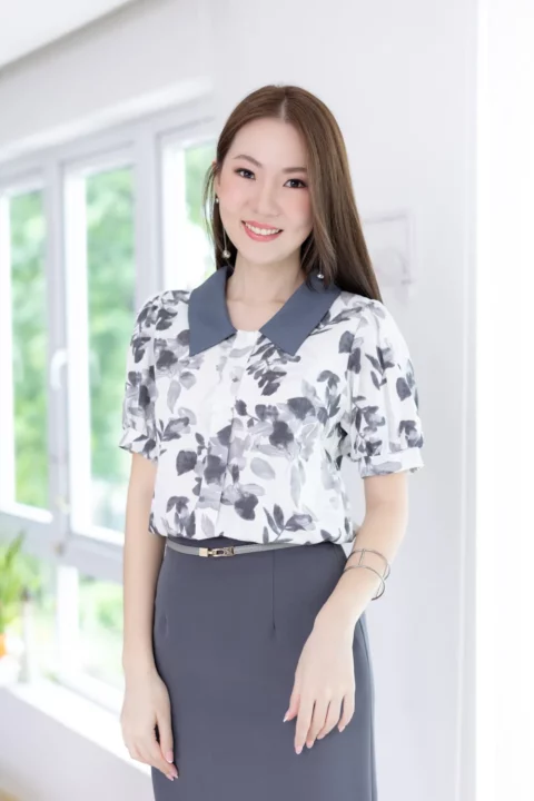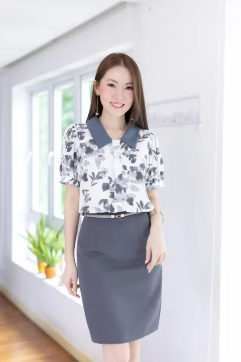 เสื้อทรงสวย แต่งสาบหลอกด้านหน้า ต่อแขนตุ๊กตา Balloon ผ้าลายดอกไม้เนื้อดีอัดย่นๆ ยืดหยุ่นนิดๆ แต่งปกสีพื้น ทรงเสื้อเป็นแบบสวม แมทช์คู่กระโปรง-กางเกงสีพื้นสวยโดดเด่นเลย