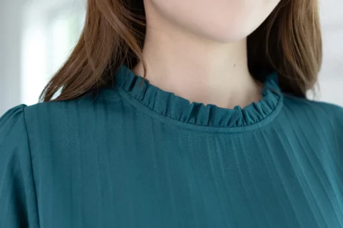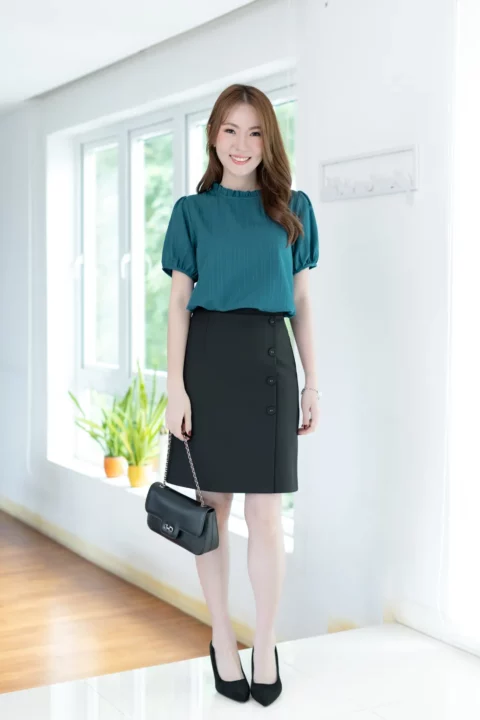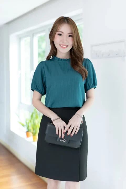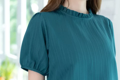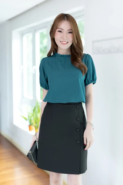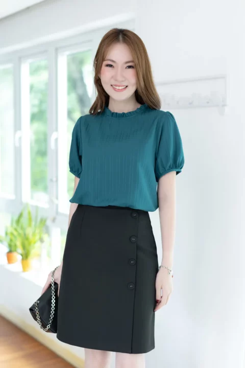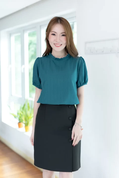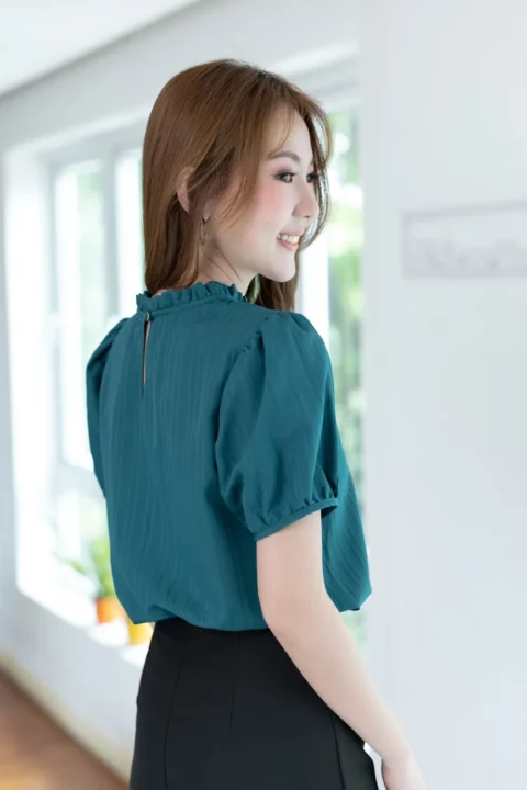 งานสวยหวานคลาสซี่ดาวล้านดวง เสื้อคอปิดจับจีบตั้งๆ แขนตุ๊กตาสั้น ด้านหลังผ่าหยดน้ำติดกระดุม ใช้ผ้าลาย Texture ริ้วยาวลงมา ไม่หนามากแต่ไม่บางโป๊ ผ้ายืดหยุ่นได้เล็กน้อยตามธรรมชาติของเนื้อผ้าแบบอัดลายค่ะ