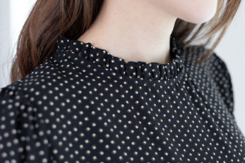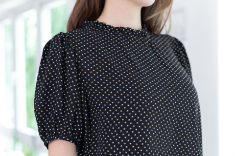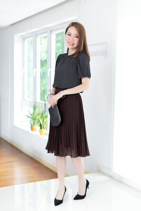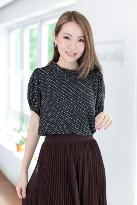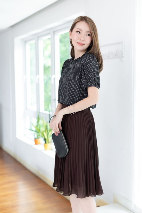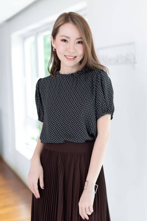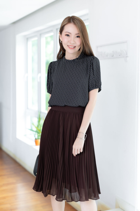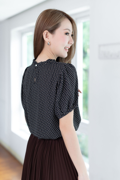 งานสวยหวานคลาสซี่ดาวล้านดวง เสื้อคอปิดจับจีบตั้งๆ แขนตุ๊กตาสั้น ด้านหลังผ่าหยดน้ำติดกระดุม ตัดเย็บด้วยชีฟองซูเปอร์เนื้อทิ้งๆ พิมพ์ลายกราฟิกเก๋กู้ด