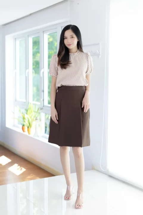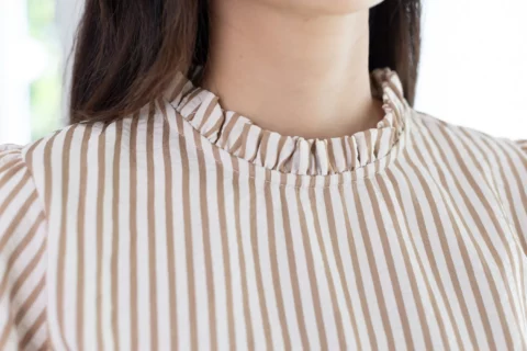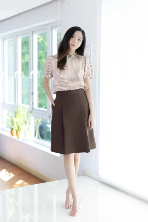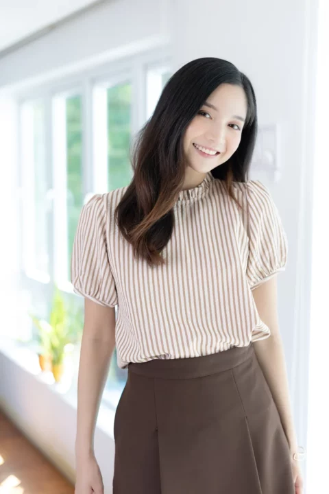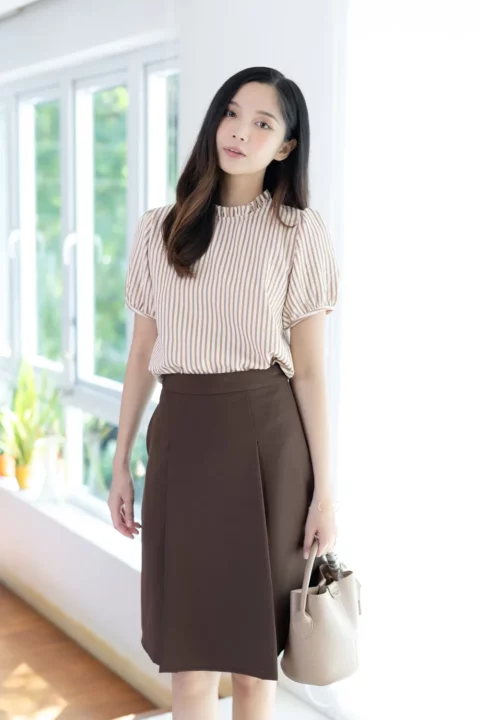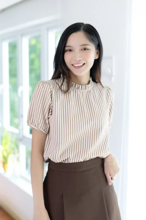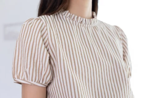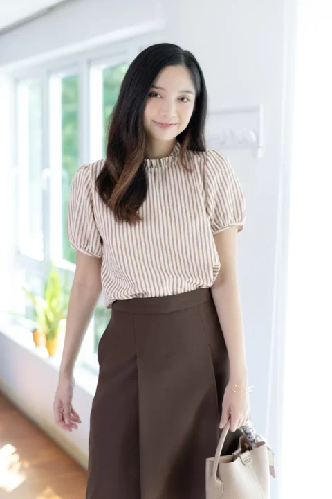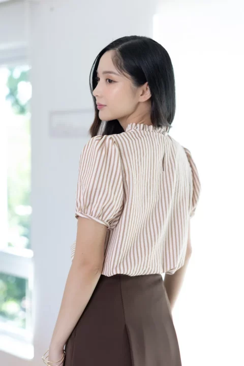 งานสวยหวานคลาสซี่ดาวล้านดวง เสื้อคอปิดจับจีบตั้งๆ แขนตุ๊กตาสั้น ด้านหลังผ่าหยดน้ำติดกระดุม ตัดเย็บด้วยผ้าลายริ้วย่นสลับเรียบ มันเก๋มั่กก