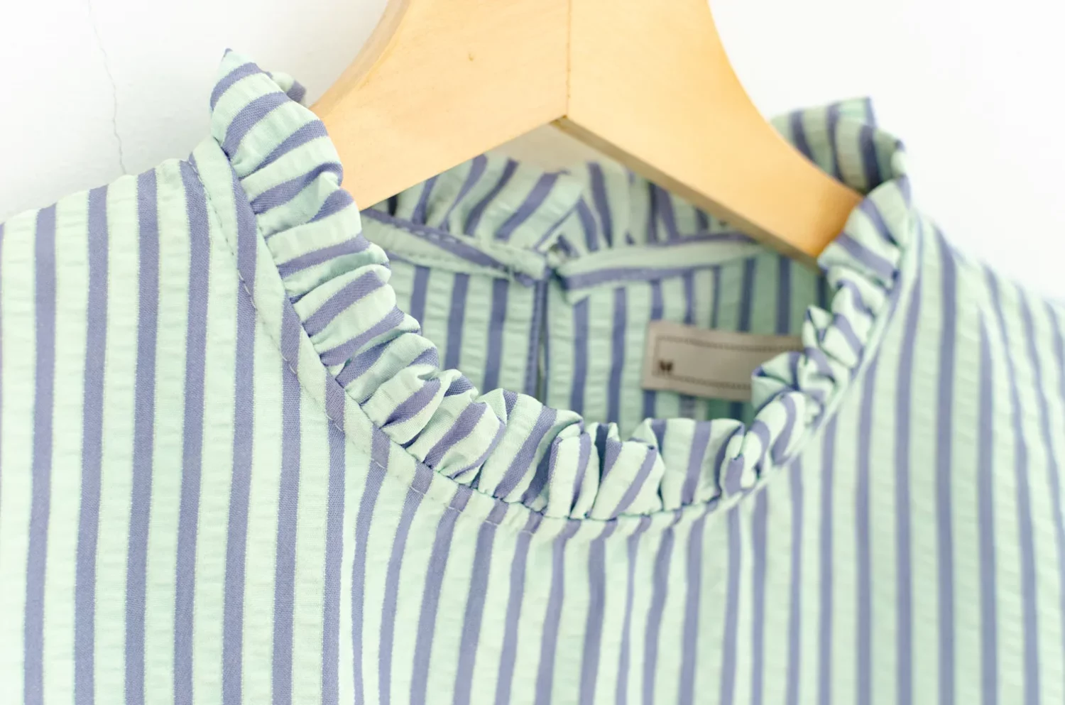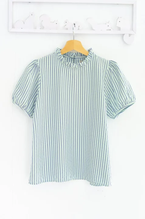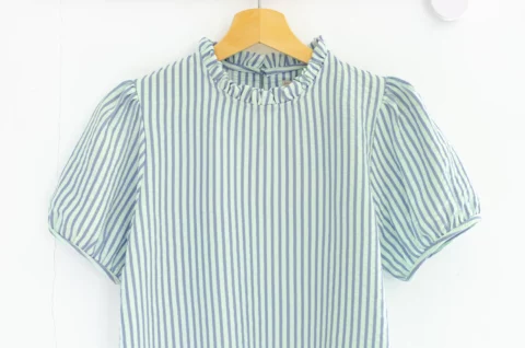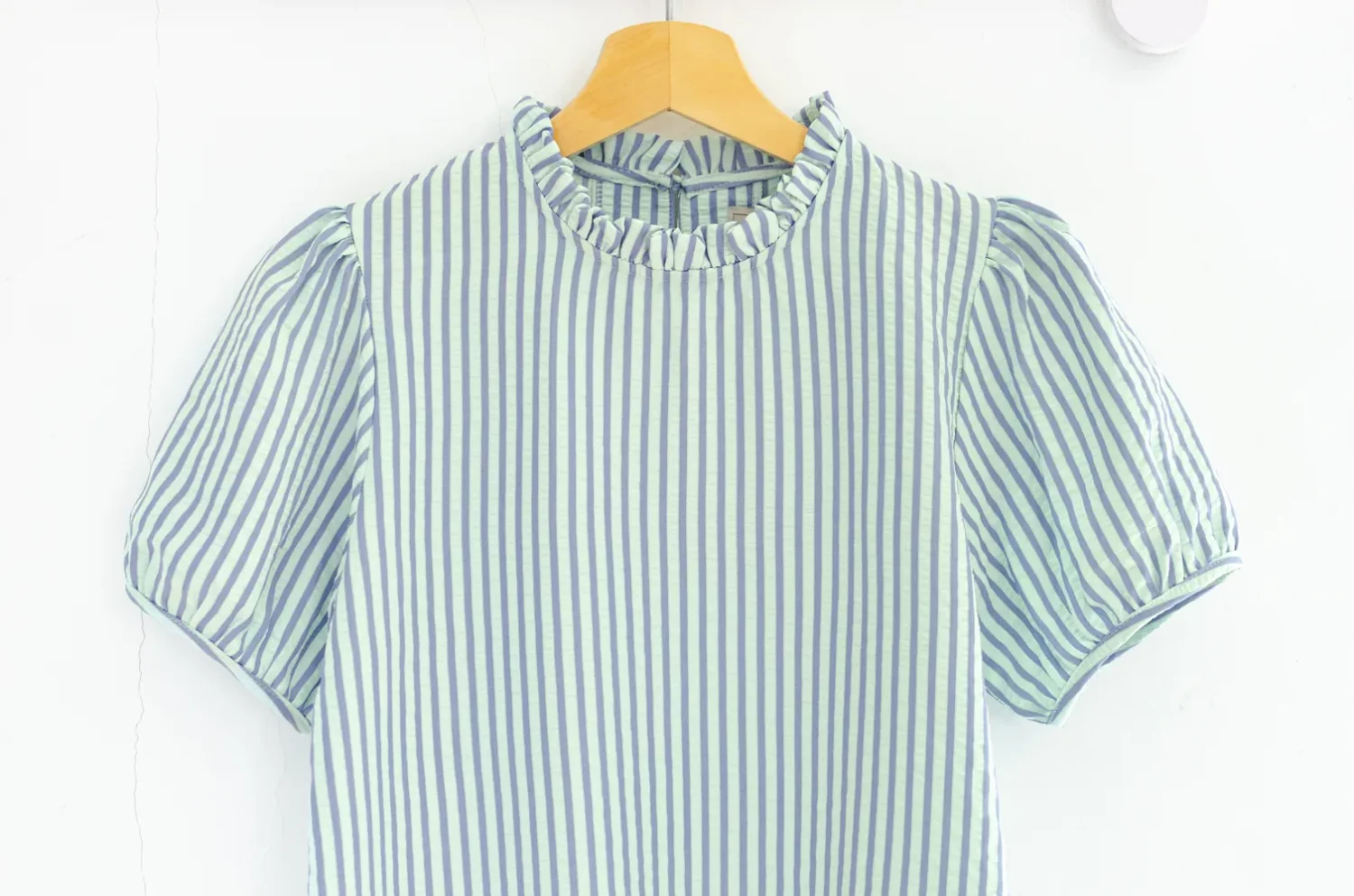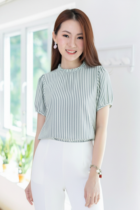 งานสวยหวานคลาสซี่ดาวล้านดวง เสื้อคอปิดจับจีบตั้งๆ แขนตุ๊กตาสั้น ด้านหลังผ่าหยดน้ำติดกระดุม ตัดเย็บด้วยผ้าลายริ้วย่นสลับเรียบ มันเก๋มั่กก