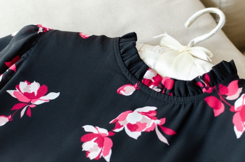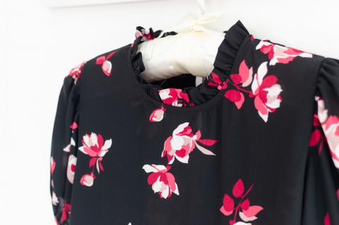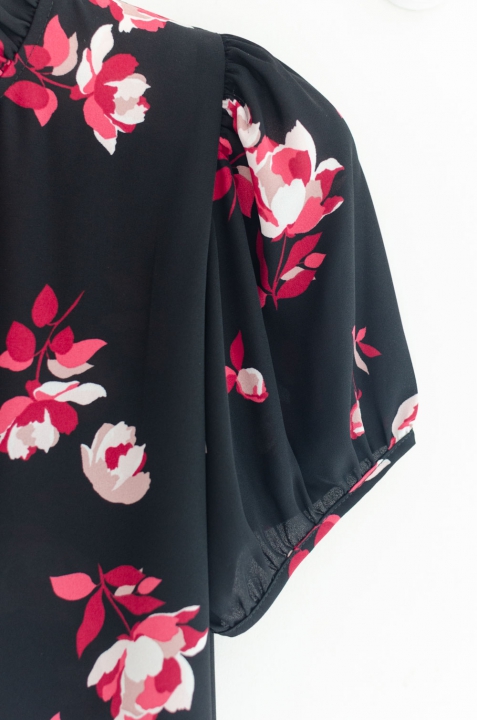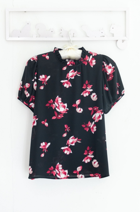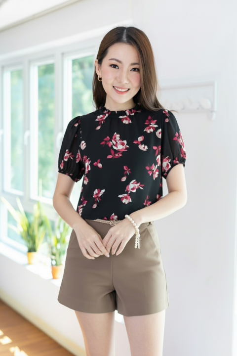 งานสวยหวาน คลาสซี่ดาวล้านดวง เสื้อคอปิดจับจีบตั้งๆ เนื้อผ้าลายดอกไม้ทิ้งตัว แขนตุ๊กตาสั้นกุ๊นปลายแขน ด้านหลังผ่าหยดน้ำติดกระดุม