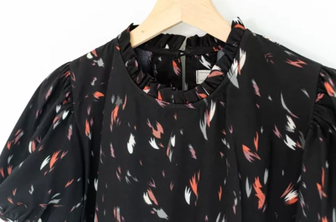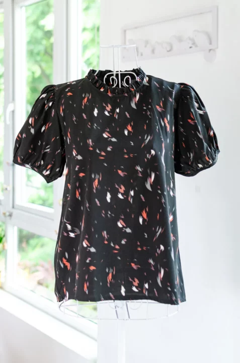 MT2710 Ruff Collar Feather Print Blouse – Black