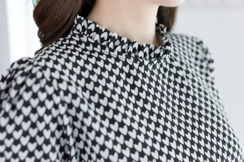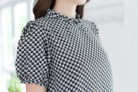 งานสวยหวานคลาสซี่ดาวล้านดวง เสื้อคอปิดจับจีบตั้งๆ แขนตุ๊กตาสั้น ด้านหลังผ่าหยดน้ำติดกระดุม ตัดเย็บด้วยผ้าไหมสปันพิมพ์ลายหัวใจเป็นแพทเทิร์นทั้งตัว มันเก๋มั่กก