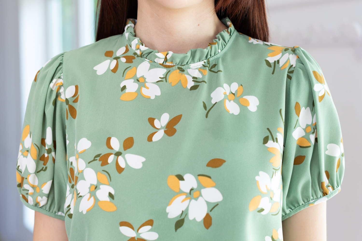 งานสวยหวาน คลาสซี่ดาวล้านดวง เสื้อคอปิดจับจีบตั้งๆ เนื้อผ้าลายดอกไม้ ทรงสวยโชว์ความพลิ้วของผ้า แขนตุ๊กตาสั้นกุ๊นปลายแขน ด้านหลังผ่าหยดน้ำติดกระดุม