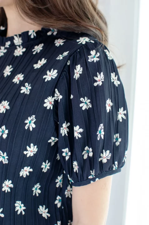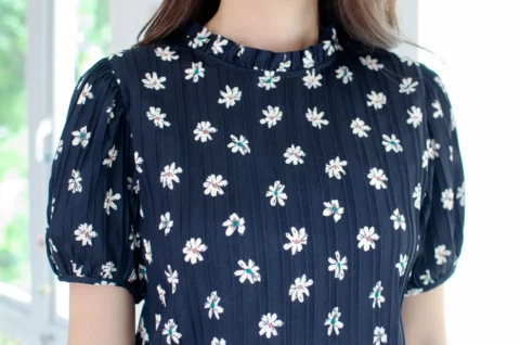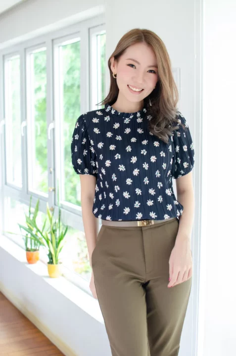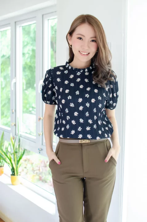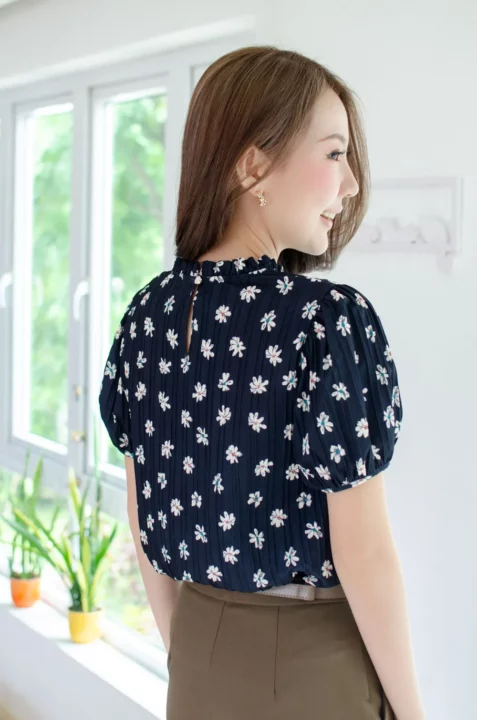 งานสวยหวานคลาสซี่ดาวล้านดวง เสื้อคอปิดจับจีบตั้งๆ ใช้ผ้าพิมพ์ลายดอกเดซี่อัดลายนูนๆ เป็น Texture ลายริ้วยาวลงมา ไม่หนามากแต่ไม่บางโป๊ แขนตุ๊กตาสั้น ด้านหลังผ่าหยดน้ำติดกระดุม