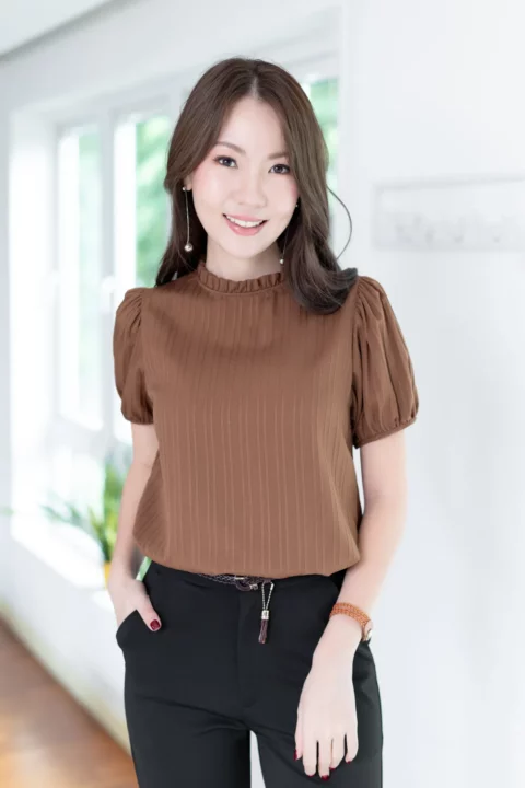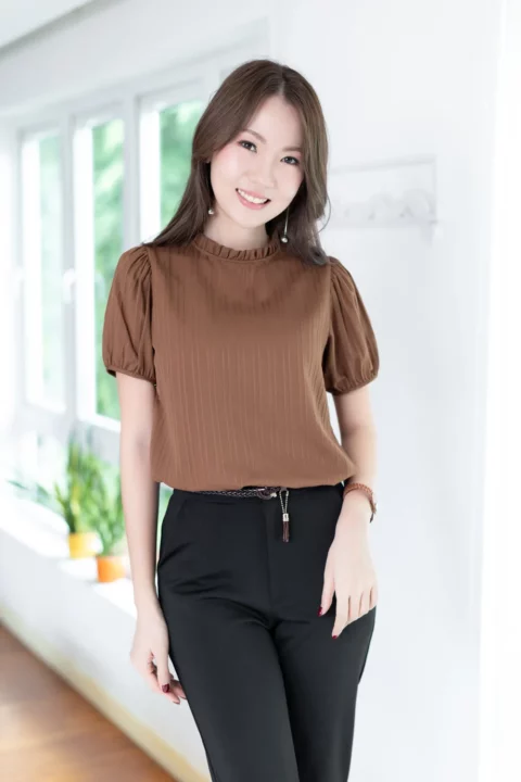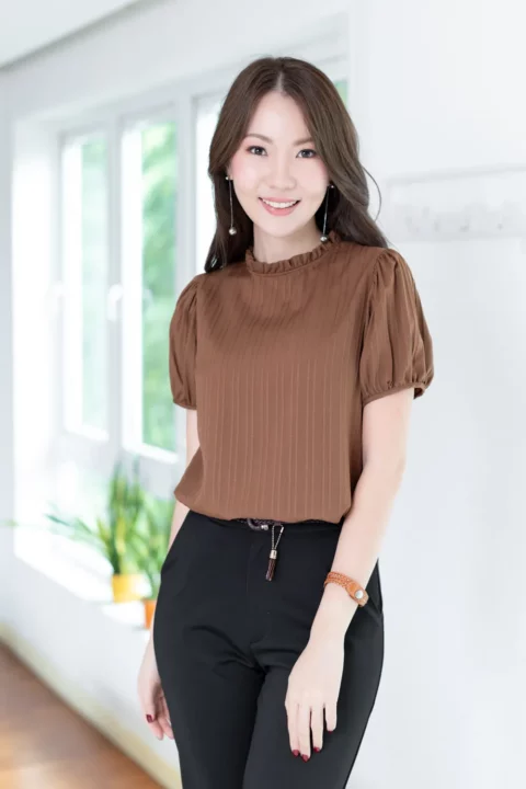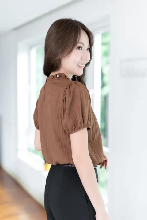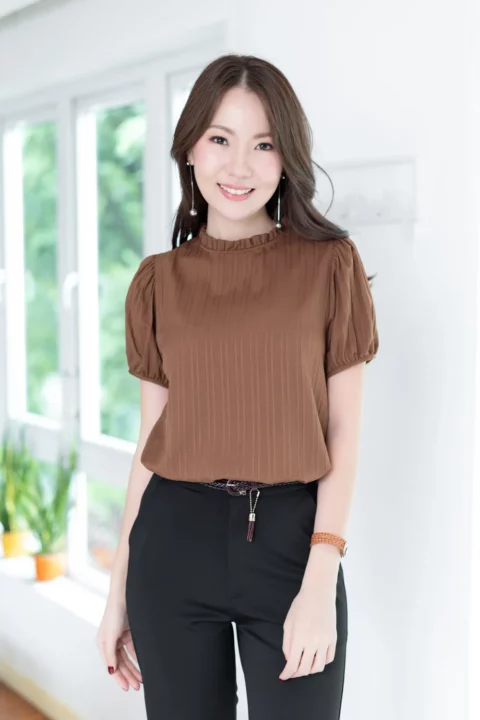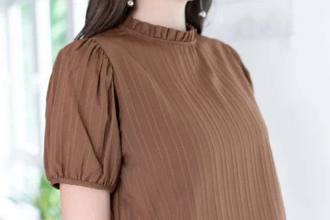 งานสวยหวานคลาสซี่ดาวล้านดวง เสื้อคอปิดจับจีบตั้งๆ แขนตุ๊กตาสั้น ด้านหลังผ่าหยดน้ำติดกระดุม ใช้ผ้าลาย Texture ริ้วยาวลงมา ไม่หนามากแต่ไม่บางโป๊ ผ้ายืดหยุ่นได้เล็กน้อยตามธรรมชาติของเนื้อผ้าแบบอัดลายค่ะ