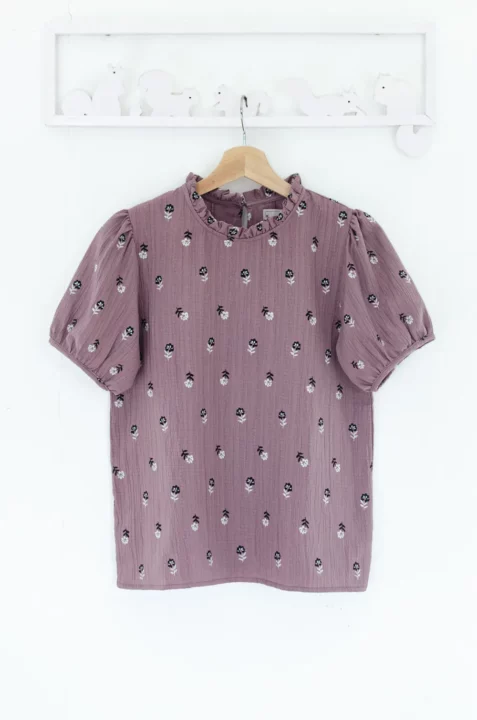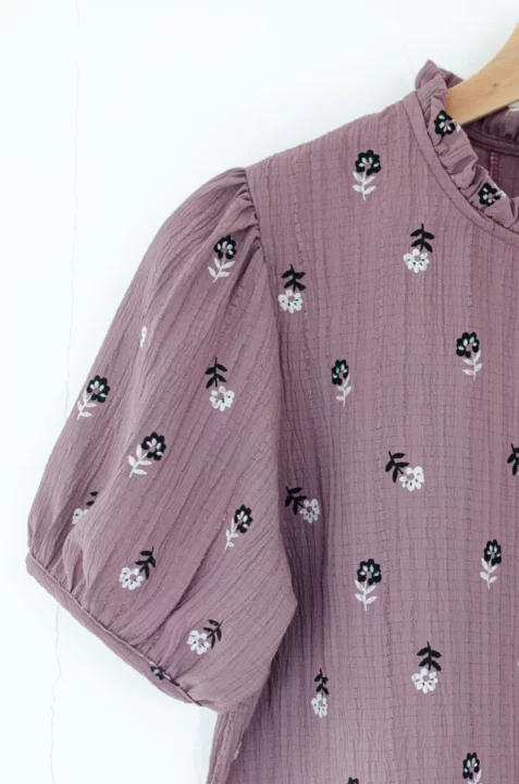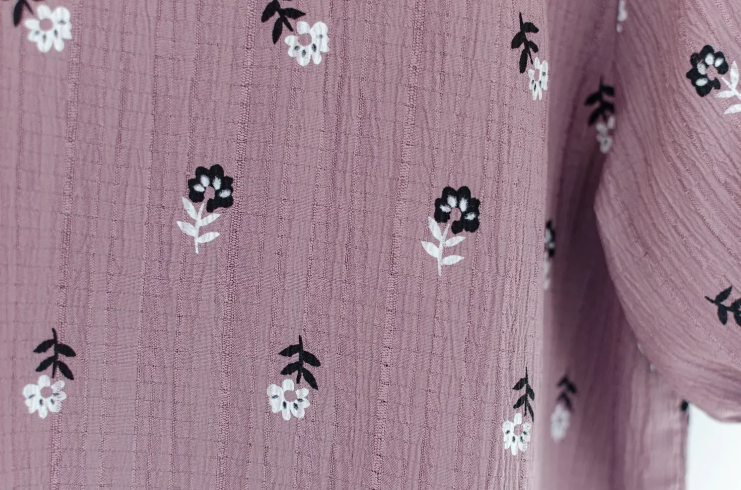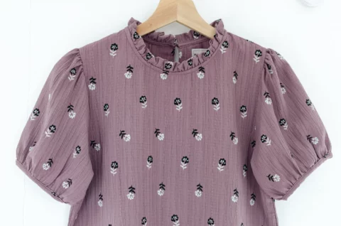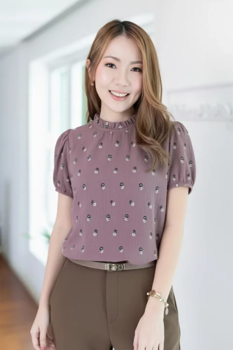 งานสวยหวานคลาสซี่ดาวล้านดวง เสื้อคอปิดจับจีบตั้งๆ แขนตุ๊กตาสั้น ด้านหลังผ่าหยดน้ำติดกระดุม ตัดเย็บด้วยผ้าด้อบบี้ครัช ทอมีลายในตัว เนื้อโปร่งกว่าไหมอิตาลีเล็กน้อย มีลายสกรีนดอกไม้เล็กๆบนผิวผ้า