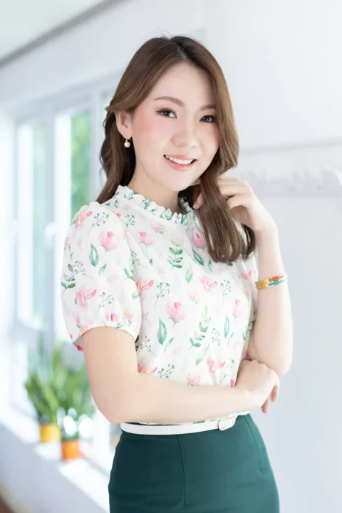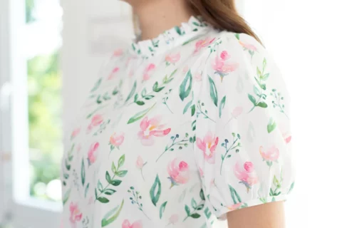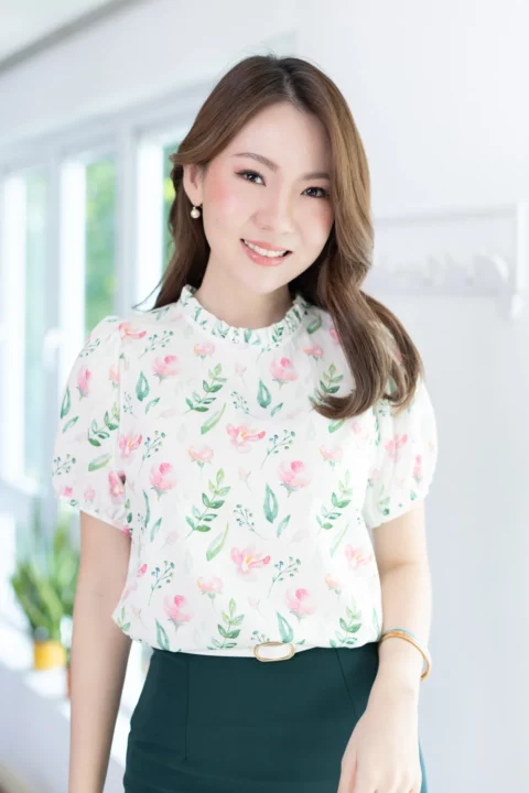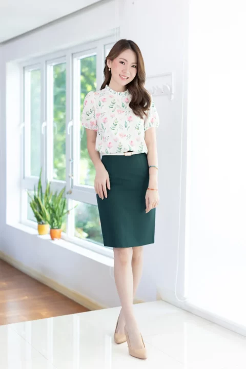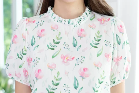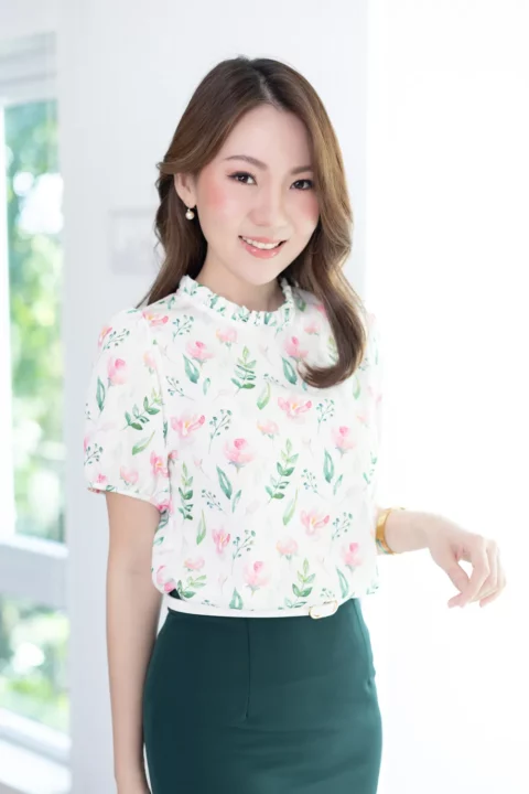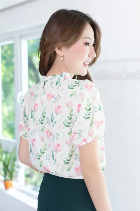 งานสวยหวานคลาสซี่ดาวล้านดวง เสื้อคอปิดจับจีบตั้งๆ แขนตุ๊กตาสั้น ด้านหลังผ่าหยดน้ำติดกระดุม ใช้ผ้าโพลีเอสเตอร์ผสมอัดลาย เนื้อจะย่นนิดๆ พิมพ์ลายดอกกุหลาบ ลายพิมพ์สวย ดูนุ่มๆอ่อนโยน