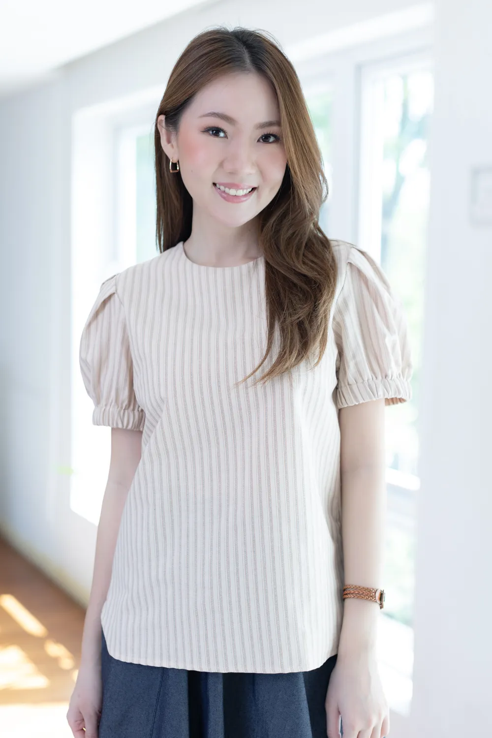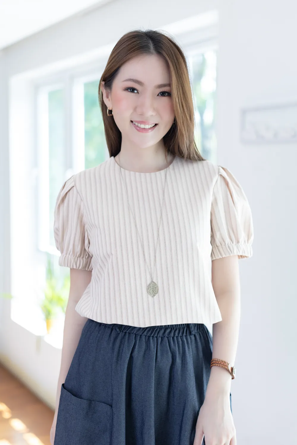 เสื้อทำงานคอกลมปิด ทรงใส่ง่ายๆมาแล้วว ทรงแขนตุ๊กตาพองนิดๆน่ารัก จีบต้นแขน จั๊มปลายยางยืดหนาพิเศษ ทรงสบายๆ ชายเสื้อตัดโค้งนิดนึง เนื้อผ้าคอตตอน ทอลายริ้วเส้นบางๆ มู้ดดูสบายๆ