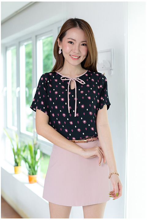 MT3201 Bow Neckline Floral Blouse – Black