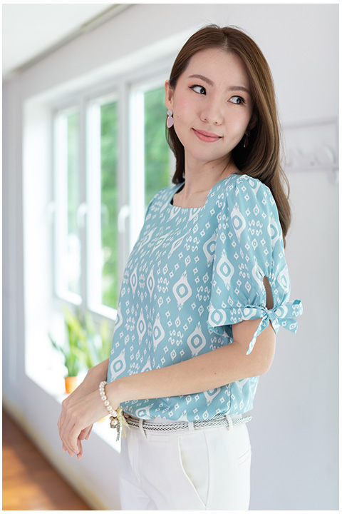 เสื้อทรงน่าร้ากก คอเหลี่ยม แขนตุ๊กตาสั้น ปลายแขนแต่งสายไว้ผูกโบว์ได้น่ารักกรุบกริบ ทรงเสื้อคอดใต้อกนิดๆ ด้านหลังผ่าหยดน้ำติดกระดุมคอ สวยงามค่า ผ้าสีฟ้าลายกราฟิกแอบได้อารมณ์ผ้าทอไทยๆนิดๆ