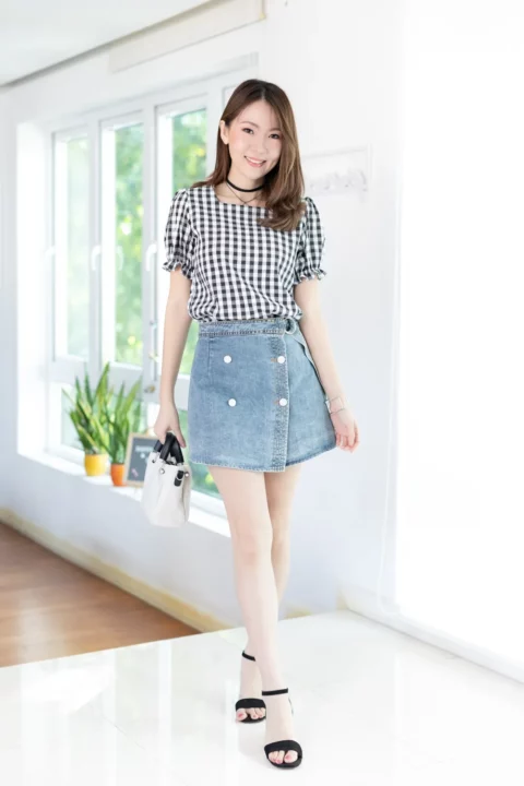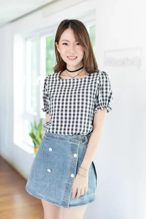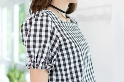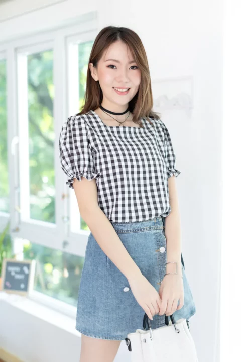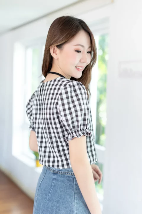 เสื้อลายตารางเติมกลิ่นความ Retro แบบน่ารัก คอเหลี่ยมแบบไม่กว้างมาก แขนตุ๊กตาจั๊มปลายยางยืด ด้านหลังผ่าหยดน้ำติดกระดุมคอ เนื้อผ้าโพลีเอสเตอร์ อัดย่นๆ ผ้ายืดเล็กน้อย ใส่แล้วโลกสดใสเลย